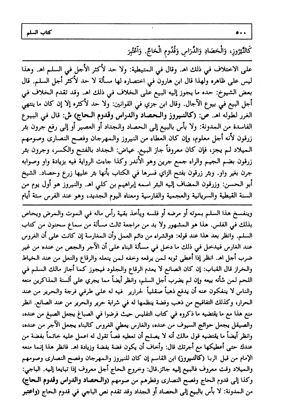 على الاختلاف في ذلك ا هـ. وقال في المتيطية: ولا حد لأكثر الأجل في السلم ا هـ. وهذا ليس على ظاهره ولهذا قال ابن هارون في اختصاره لها مسألة لا حد لأكثر أجل السلم قال بعض الشيوخ: حده ما يجوز إليه البيع على الخلاف في ذلك ا هـ. وقد تقدم الخلاف في أجل البيع في بيوع الآجال، وقال ابن جزي في القوانين: "ولا حد لأكثره إلا إن كان ما ينتهي الغرر لطوله" ا هـ. ص: (كالنيروز والحصاد والدراس وقدوم الحاج) ش: قال في البيوع الفاسدة من المدونة: ولا بأس بالبيع إلى الحصاد والجداد أو العصير أو إلى رفع جرون بئر زرقون؛ لأنه أجل معلوم وإن كان العطاء من النيروز والمهرجان وفصح النصارى وصومهم الميلاد لم يجز فإن كان معروفا جاز البيع، عياض. الجداد بالفتح والكسر وجرون بئر زرقون بضم الجيم والراء جمع جرين، وهو الأندر وكذا جاءت الرواية فيه بزيادة واو وصوابه جرن بغير واو، وبئر زرقون بفتح الزاي فسرها في الكتاب بأنها بئر عليها زرع وحصاد، الشيخ أبو الحسن وزرقون المضاف إليه البئر اسمه إبراهيم بن كلى ا هـ. والنيروز هو أول يوم من السنة القبطية والسريانية والعجمية والفارسية ومعناه اليوم الجديد، وهو عند الفرس ستة أيام