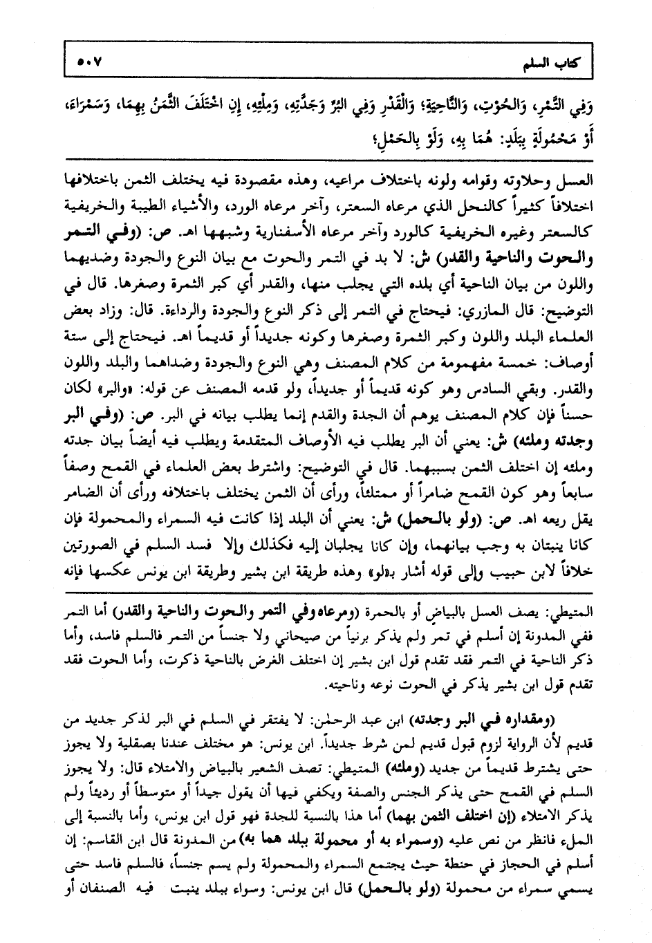 العسل وحلاوته وقوامه ولونه باختلاف مراعيه وهذه مقصودة فيه يختلف الثمن باختلافها اختلافا كثيرا كالنحل الذي مرعاه السعتر وآخر مرعاه الورد والأشياء الطيبة والخريفية كالسعتر وغير الخريفية كالورد وآخر مرعاه الأسفنارية وشبهها ا هـ. ص:(وفي التمر والحوت والناحية والقدر) ش لا بد في التمر والحوت مع بيان النوع والجودة وضديهما واللون من بيان الناحية أي بلده التي يجلب منها والقدر أي كبر التمرة وصغرها قال في التوضيح قال المازري: فيحتاج في التمر إلى ذكر النوع والجودة والرداءة قال: وزاد بعض العلماء البلد واللون وكبر الثمرة وصغرها وكونه جديدا أو قديما ا هـ. فيحتاج إلى ستة أوصاف، خمسة مفهومة من كلام المصنف وهي النوع والجودة وضداهما والبلد واللون والقدر وبقي السادس، وهو كونه قديما أو جديدا ولو قدمه المصنف عن قوله والبر لكان حسنا فإن كلام المصنف يوهم أن الجدة والقدم إنما يطلب بيانه في البر. ص:(وفي البر وجدته وملئه) ش: يعني أن البر يطلب فيه الأوصاف المتقدمة ويطلب فيه أيضا بيان جدته وملئه إن اختلف الثمن بسببهما قال في التوضيح: واشترط بعض العلماء في القمح وصفا سابعا، وهو كون القمح ضامرا أو ممتلئا ورأى أن الثمن يختلف باختلافه ورأى أن الضامر يقل ريعه ا هـ. ص:(ولو بالحمل) ش: يعني أن البلد إذا كانت فيه السمراء والمحمولة فإن كانا ينبتان به وجب بيانهما وإن كانا يجلبان إليه فكذلك وإلا فسد السلم في الصورتين خلافا لابن حبيب وإلى قوله أشار بلو وهذه طريقة ابن بشير وطريقة ابن يونس عكسها فإنه