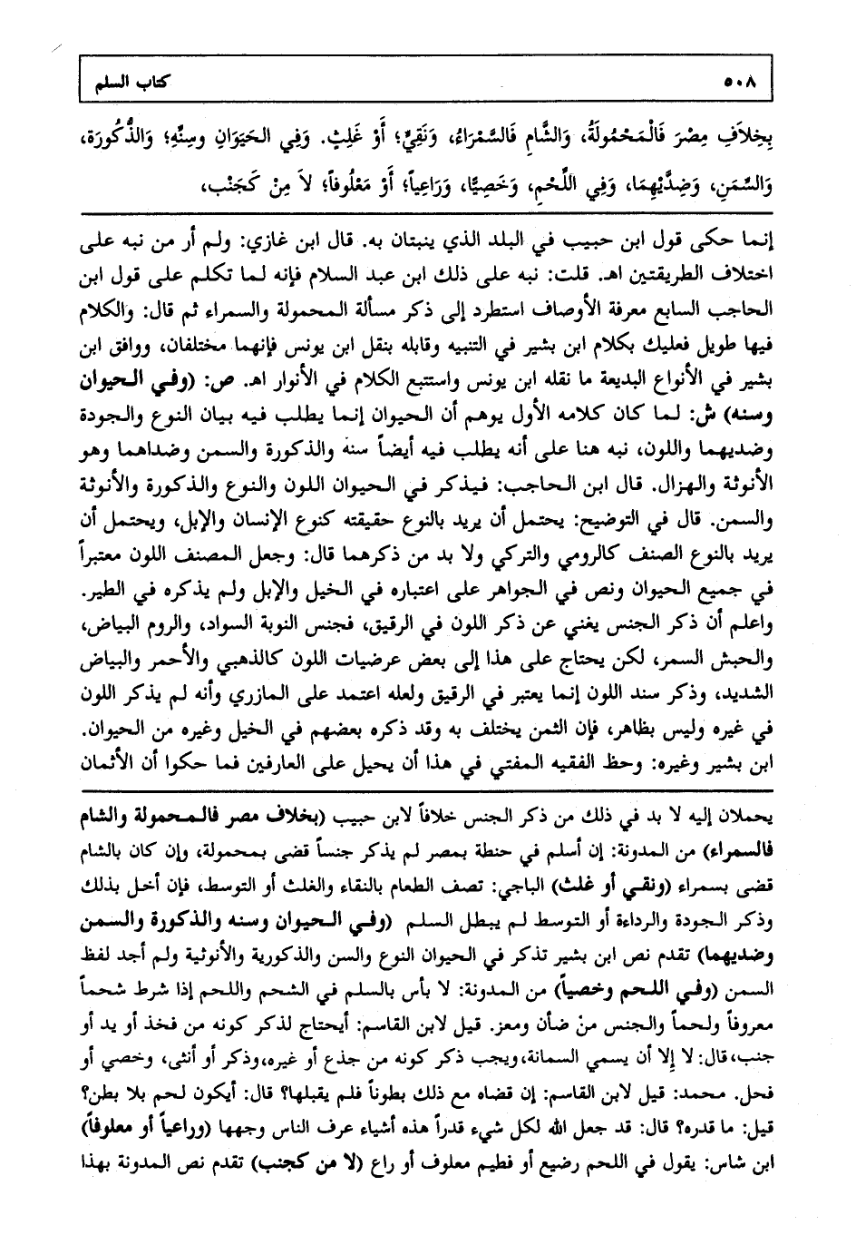 إنما حكى قول ابن حبيب في البلد الذي ينبتان به قال ابن غازي: ولم أر من نبه على اختلاف الطريقين ا هـ. قلت: نبه على ذلك ابن عبد السلام فإنه لما تكلم على قول ابن الحاجب: السابع معرفة الأوصاف، استطرد إلى ذكر مسألة المحمولة والسمراء، ثم قال: والكلام فيها طويل فعليك بكلام ابن بشير في التنبيه وقابله بنقل ابن يونس فإنهما مختلفان ووافق ابن بشير في الأنواع البديعة ما نقله ابن يونس واستتبع الكلام في الأنوار ا هـ. ص:(وفي الحيوان وسنه) ش: لما كان كلامه الأول يوهم أن الحيوان إنما يطلب فيه بيان النوع والجودة وضديهما واللون نبه هنا على أنه يطلب فيه أيضا سنه والذكورة والسمن وضداهما، وهو الأنوثة والهزال قال ابن الحاجب فيذكر في الحيوان اللون والنوع والذكورة والأنوثة والسمن قال في التوضيح: يحتمل أن يريد بالنوع حقيقته كنوع الإنسان والإبل ويحتمل أن يريد بالنوع الصنف كالرومي والتركي ولا بد من ذكرهما قال: وجعل المصنف اللون معتبرا في جميع الحيوان ونص:في الجواهر على اعتباره في الخيل والإبل ولم يذكره في الطير واعلم أن ذكر الجنس يغني عن ذكر اللون في الرقيق فجنس النوبة السواد والروم البياض والحبش السمر لكن يحتاج على هذا إلى بعض عرضيات اللون كالذهبي والأحمر والبياض الشديد، وذكر سند اللون إنما يعتبر في الرقيق ولعله اعتمد على المازري، وأنه لم يذكر اللون في غيره وليس بظاهر فإن الثمن يختلف به وقد ذكره بعضهم في الخيل وغيره من الحيوان ابن بشير وغيره وحظ الفقيه المفتي في هذا أن يحيل على العارفين فما حكوا أن الأثمان
