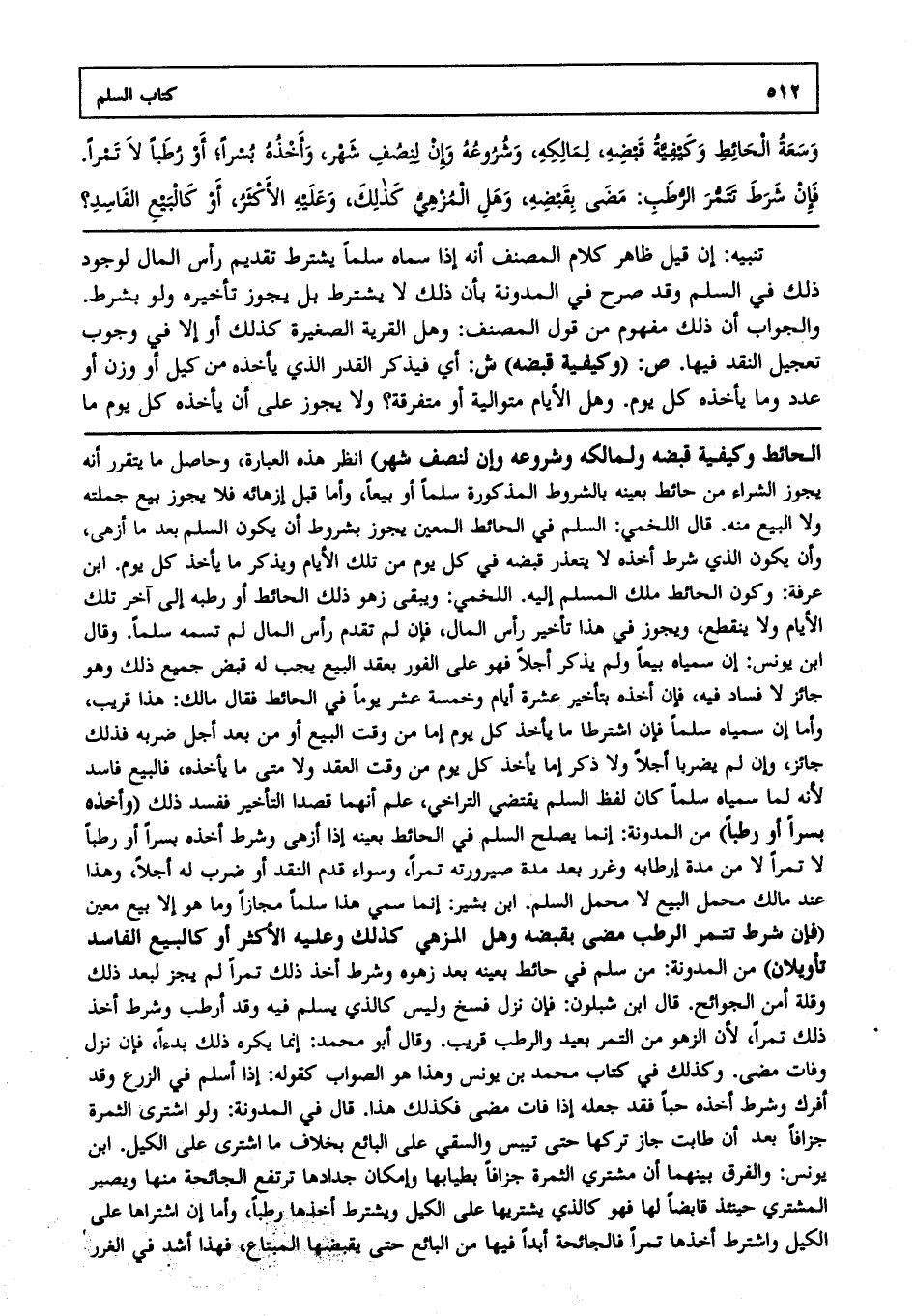 وسعة الحائط وكيفية قبضه, لمالكه, وشروعه وإن لنصف شهر, وأخذه بسرا؛ أو رطبا لا تمرا. فإن شرط تتمر الرطب: مضى بقبضه, وهل المزهي كذلك ؟ وعليه الأكثر أو كالبيع الفاسد ؟