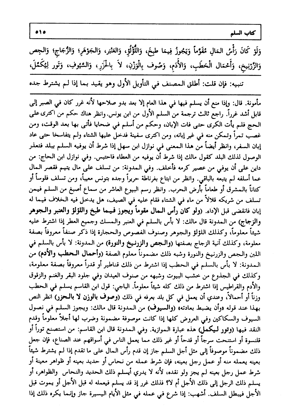 ولو كان رأس المال مقوما ويجوز فيما طبخ, واللؤلؤ, والعنبر, والجوهر؛ والزجاج؛ والجص والزرنيخ, وأحمال الحطب, والأدم, وصوف بالوزن, لا بالحزر, والسيوف, وتور ليكمل,