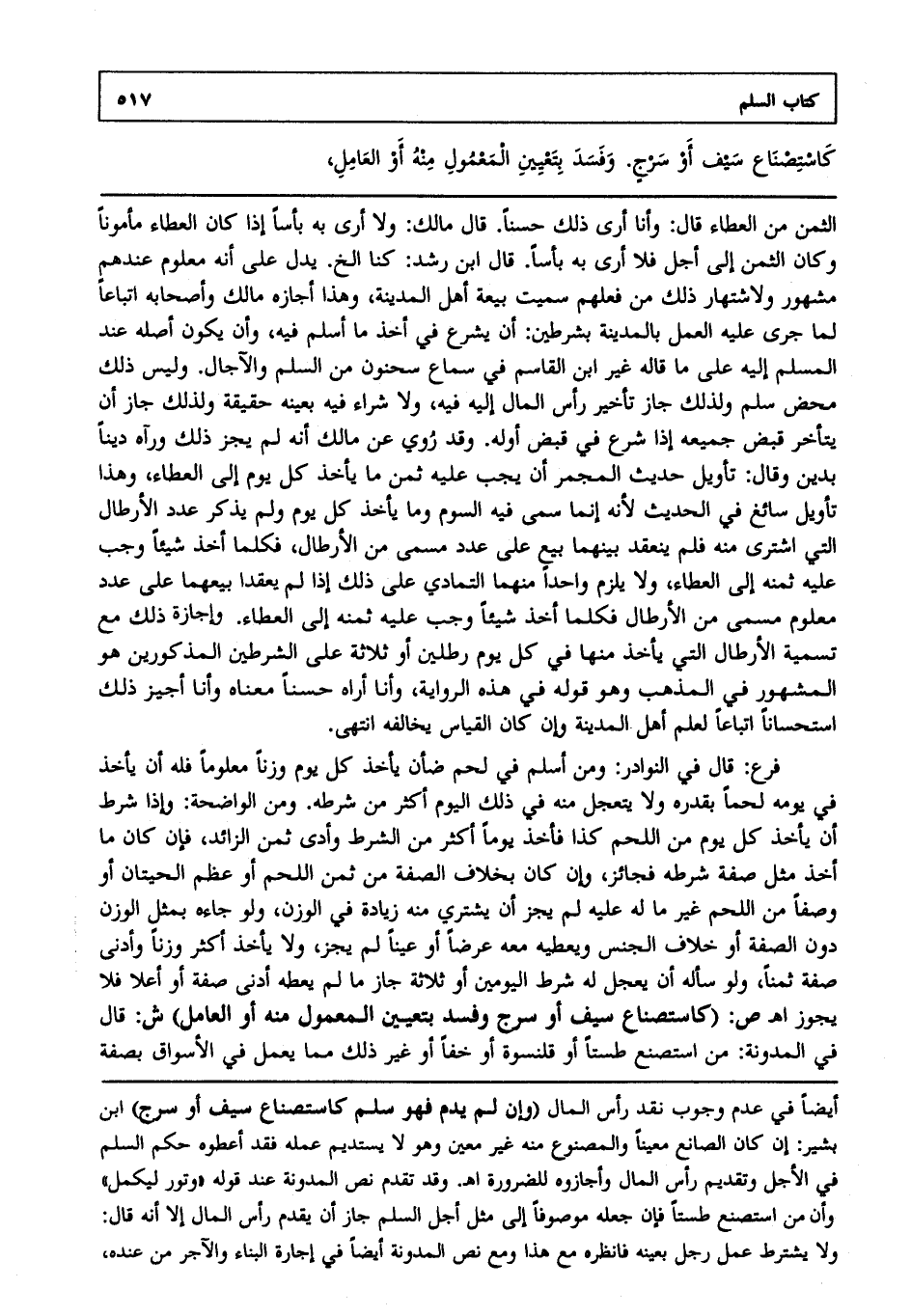 فرع: قال في النوادر: ومن أسلم في لحم ضأن يأخذ كل يوم وزنا معلوما فله أن يأخذه في يومه لحما يقدره ولا يتعجل منه في ذلك اليوم أكثر من شرطه ومن الواضحة وإذا شرط أن يأخذ كل يوم من اللحم كذا فأخذ يوما أكثر من الشرط وأدى ثمن الزائد فإن كان ما أخذ مثل صفة شرطه فجائر وإن كان بخلاف الصفة من ثمن اللحم أو عظم الحيتان أو وصفا من اللحم غير ما له عليه لم يجز أن يشتري منه زيادة في الوزن ولو جاءه بمثل الوزن دون الصفة أو خلاف الجنس ويعطيه معه عرضا أو عينا لم يجز ولا يأخذ أكثر وزنا وأدنى صفة ثمنا ولو سأله أن يعجل له شرط اليومين أو ثلاثة جاز ما لم يعطه أدنى صفة أو أعلى فلا يجوز ا هـ. ص:(كاستصناع سيف أو سرج وفسد بتعيين المعمول منه أو العامل) ش: قال في المدونة: من استصنع طستا أو قلنسوة أو خفا أو غير ذلك مما يعمل في الأسواق بصفة