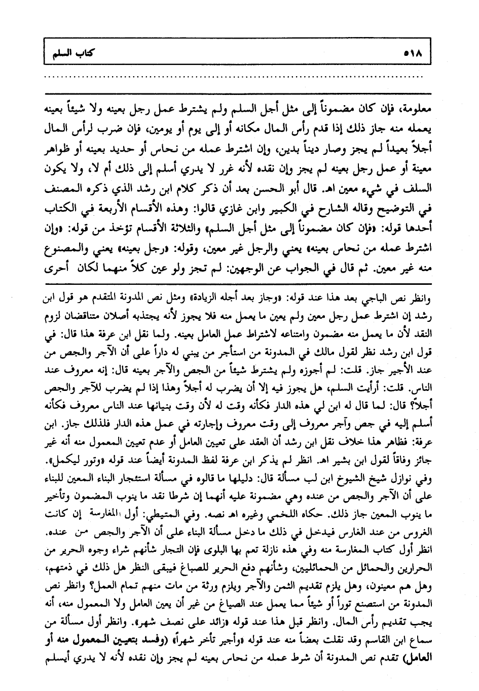 معلومة فإن كان مضمونا إلى مثل أجل السلم ولم يشترط عمل رجل بعينه ولا شيئا بعينه يعمله منه جاز ذلك إذا قدم رأس المال مكانه أو إلى يوم أو يومين فإن ضرب لرأس المال أجلا بعيدا لم يجز وصار دينا بدين وإن اشترط عمله من نحاس أو حديد بعينه أو ظواهر معينة أو عمل رجل بعينه لم يجز وإن نقده؛ لأنه غرر لا يدري أسلم إلى ذلك أم لا ولا يكون السلف في شيء معين ا هـ قال أبو الحسن بعد أن ذكر كلام ابن رشد الذي ذكره المصنف في التوضيح، وقاله الشارح في الكبير وابن غازي قالوا وهذه الأقسام الأربعة في الكتاب أحدها قوله: فإن كان مضمونا إلى مثل أجل السلم، والثلاثة الأقسام تؤخذ من قوله وإن اشترط عمله من نحاس بعينه يعني والرجل غير معين، وقوله: رجل بعينه يعني والمصنوع منه غير معين، ثم قال في الجواب عن الوجهين لم تجز ولو عين كلا منهما لكان أحرى