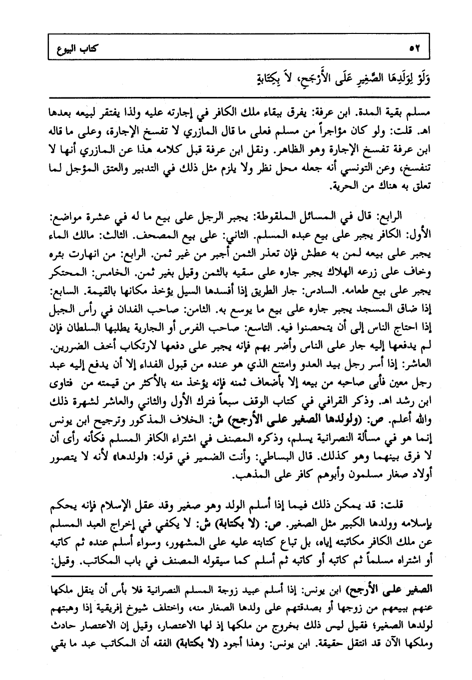 الرابع: قال في المسائل الملقوطة: يجبر الرجل على بيع ماله في عشرة مواضع الأول الكافر يجبر على بيع عبده المسلم، الثاني على بيع المصحف، الثالث مالك الماء يجبر على بيعه لمن به عطش فإن تعذر الثمن أجبر من غير ثمن. الرابع من انهارت بئره وخاف على زرعه الهلاك يجبر جاره على سقيه بالثمن، وقيل بغير ثمن، الخامس المحتكر يجبر على بيع طعامه، السادس جار الطريق إذا أفسدها السيل يؤخذ مكانها بالقيمة، السابع إذا ضاق المسجد يجبر جاره على بيع ما يوسع به، الثامن صاحب الفدان في رأس الجبل إذا احتاج الناس إلى أن يتحصنوا فيه، التاسع صاحب الفرس أو الجارية يطلبها السلطان فإن لم يدفعها إليه جار على الناس، وأضر بهم فإنه يجبر على دفعها لارتكاب أخف الضررين، العاشر إذا أسر رجل بيد العدو، وامتنع الذي هو عنده من قبول الفداء إلا أن يدفع إليه عبد رجل معين فأبى صاحبه من بيعه إلا بأضعاف ثمنه فإنه يؤخذ منه بالأكثر من قيمته من فتاوى ابن رشد ا هـ. وذكر القرافي في كتاب الوقف سبعا فترك الأول، والثاني والعاشر لشهرة ذلك، والله أعلم. ص: (ولولدها الصغير على الأرجح) ش: الخلاف المذكور وترجيح ابن يونس إنما هو في مسألة النصرانية يسلم، وذكره المصنف في اشتراء الكافر المسلم، فكأنه رأى أن لا فرق بينهما، وهو كذلك قال البساطي: وأنث الضمير في قوله لولدها؛ لأنه لا يتصور أولاد صغار مسلمون، وأبوهم كافر على المذهب.