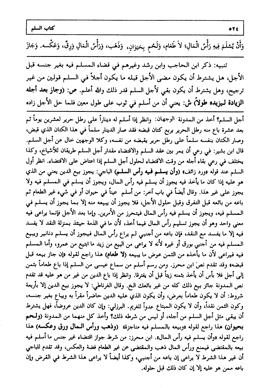 وأن يسلم فيه رأس المال؛ لا طعام ولحم بحيوان, وذهب, ورأس المال ورق, وعكسه. وجاز