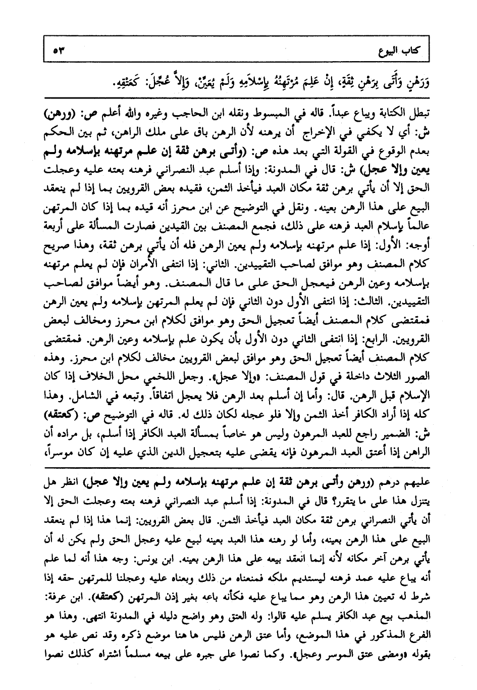 تبطل الكتابة، ويباع عبدا قاله في المبسوط، ونقله ابن الحاجب، وغيره، والله أعلم. ص: (ورهن) ش: أي لا يكفي في الإخراج أن يرهنه؛ لأن الرهن باق على ملك الراهن ثم بين الحكم بعدم الوقوع في القولة التي بعد هذه ص: (وأتى برهن ثقة إن علم مرتهنه بإسلامه ولم يعين، وإلا عجل) ش: قال في المدونة: وإذا أسلم عبد النصراني فرهنه بعته عليه وعجلت الحق إلا أن يأتي برهن ثقة مكان العبد فيأخذ الثمن فقيده بعض القرويين بما إذا لم ينعقد البيع على هذا الرهن بعينه، ونقل في التوضيح عن ابن محرز أنه قيده بما إذا كان المرتهن عالما بإسلام العبد فرهنه على ذلك فجمع المصنف بين القيدين فصارت المسألة على أربعة أوجه: الأول إذا علم مرتهنه بإسلامه، ولم يعين الرهن فله أن يأتي برهن ثقة وهذا صريح كلام المصنف وهو موافق لصاحب التقييدين. الثاني إذا انتفى الأمران فإن لم يعلم مرتهنه بإسلامه، وعين الرهن فيعجل الحق على ما قال المصنف: وهو أيضا موافق لصاحب التقييدين. الثالث إذا انتفى الأول دون الثاني فإن لم يعلم المرتهن بإسلامه، ولم يعين الرهن فمقتضى كلام المصنف أيضا تعجيل الحق وهو موافق لكلام ابن محرز ومخالف لبعض القرويين. الرابع إذا انتفى الثاني دون الأول بأن يكون علم بإسلامه، وعين الرهن فمقتضى كلام المصنف أيضا تعجيل الحق، وهو موافق لبعض القرويين مخالف لكلام ابن محرز، وهذه الصور الثلاث داخلة في قول المصنف "وإلا عجل" وجعل اللخمي محل الخلاف إذا كان الإسلام قبل الرهن قال: وأما إن أسلم بعد الرهن فلا يعجل اتفاقا وتبعه في الشامل، وهذا كله إذا أراد الكافر أخذ الثمن وإلا فلو عجله لكان ذلك له قاله في التوضيح ص: (كعتقه) ش: الضمير راجع للعبد المرهون، وليس هو خاصا بمسألة العبد الكافر إذا أسلم بل مراده أن الراهن إذا أعتق العبد المرهون فإنه يقضى عليه بتعجيل الدين الذي عليه إن كان موسرا،