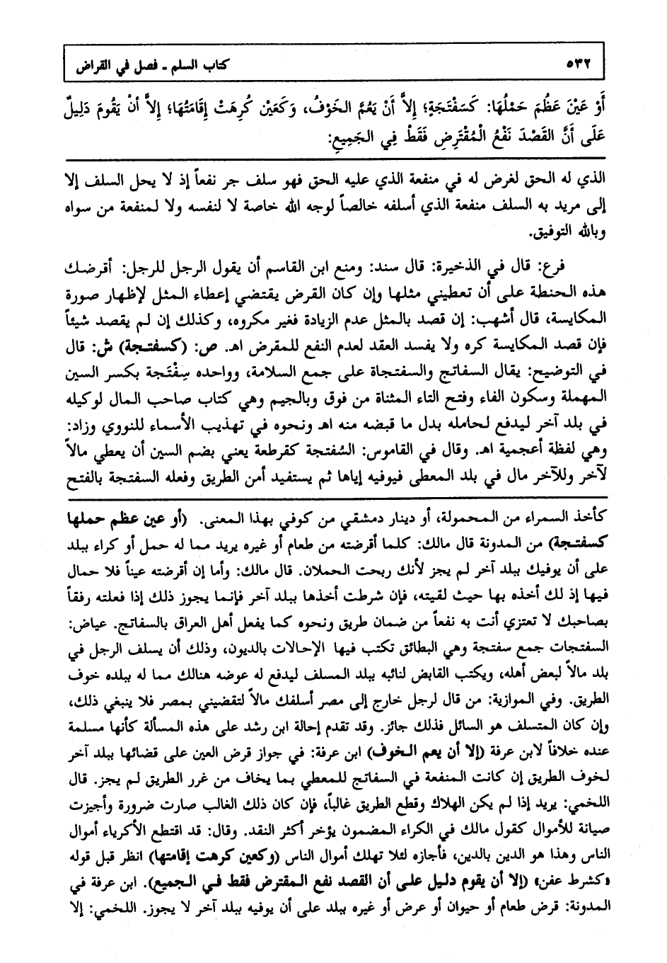 فرع: قال في الذخيرة قال سند: ومنع ابن القاسم أن يقول الرجل للرجل أقرضك هذه الحنطة على أن تعطيني مثلها وإن كان القرض يقتضي إعطاء المثل لإظهار صورة المكايسة قال أشهب: إن قصد بالمثل عدم الزيادة فغير مكروه وكذلك إن لم يقصد شيئا فإن قصد المكايسة كره ولا يفسد العقد لعدم النفع للمقرض ا هـ. ص:(كسفتجة) ش: قال في التوضيح قال السفاتج والسفتجاة على جمع السلامة واحده سفتجة بكسر السين المهملة وسكون الفاء وفتح التاء المثناة من فوق وبالجيم وهي كتاب صاحب المال لوكيله في بلد آخر ليدفع لحامله بدل ما قبضه منه ا هـ. ونحوه في تهذيب الأسماء للنووي وزاد وهي لفظة أعجمية ا هـ. وقال في القاموس: السفتجة كقرطقة يعني بضم السين أن يعطي مالا لآخر وللآخر مال في بلد المعطى فيوفيه إياهم، ثم يستفيد أمن الطريق، وفعله السفتجة بالفتح