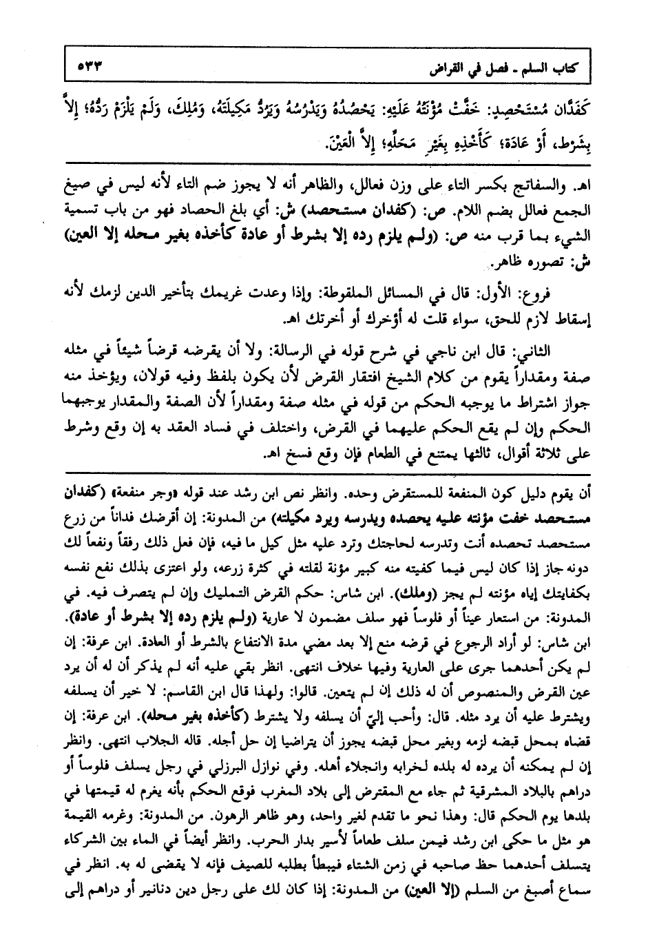 ا هـ. والسفاتج بكسر التاء على وزن فعالل والظاهر أنه لا يجوز ضم التاء؛ لأنه ليس في صيغ الجمع فعالل بضم اللام. ص:(كفدان مستحصد) ش: أي بلغ الحصاد فهو من باب تسمية الشيء بما قرب منه. ص:(ولم يلزم رده إلا بشرط أو عادة كأخذه بغير محله إلا العين) ش: تصوره ظاهر