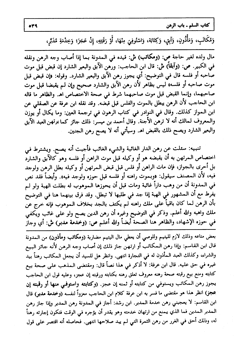 مال ولده لغير حاجة. ص:(ومكاتب) ش: قيده في المدونة بما إذا أصاب وجه الرهن ونقله في الكبير ص:(وآبق) ش: قال ابن الحاجب ورهن الآبق والبعير الشارد إن قبض قبل موت صاحبه أو فلسه قال في التوضيح أي: يجوز رهن الآبق والبعير الشارد، وقوله: إن قبض قبل موت صاحبه أو فلسه ليس بظاهر؛ لأن رهن الآبق والشارد صحيح وإن لم يقبضا قبل موت صاحبهما وإنما القبض قبل موت صاحبهما شرط في صحة الاختصاص ا هـ. والظاهر ما قاله ابن الحاجب؛ لأن الرهن يبطل بالموت والفلس قبل قبضه وقد نقله ابن عرفة عن الصقلي عن ابن المواز كذلك وقال في النوادر في كتاب الرهون في ترجمة العين وما يكال أو يوزن والمعروف لمالك أنه لا ترهن الأجنة وقال أحمد بن ميسر ذلك جائز كما يرتهن العبد الآبق والبعير الشارد ويصح ذلك بالقبض ا هـ. وسيأتي أنه لا يصح رهن الجنين.