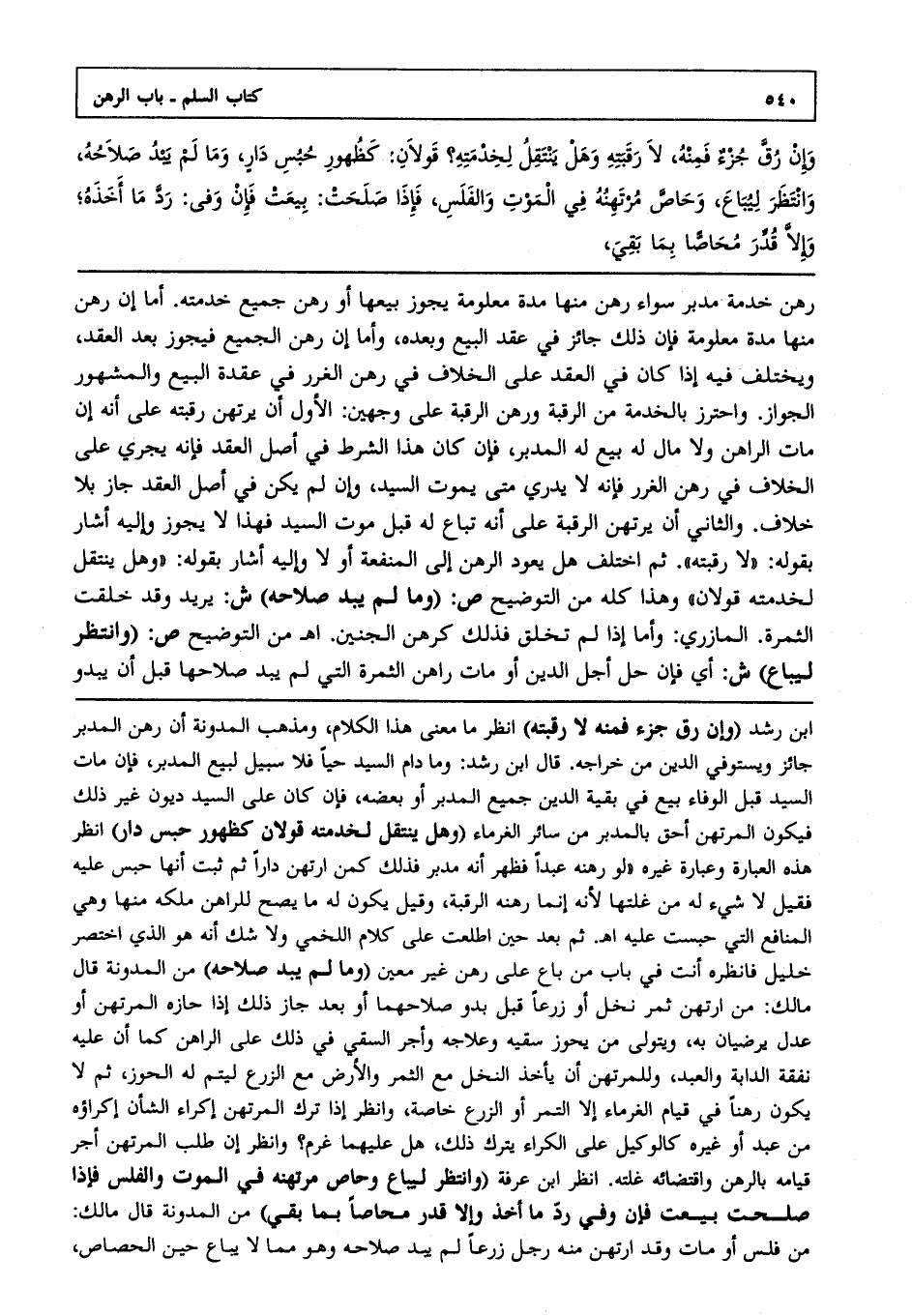 رهن خدمة مدبر سواء رهن منها مدة معلومة يجوز بيعها أو رهن جميع خدمته، أما إن رهن منها مدة معلومة فإن ذلك جائز في عقد البيع وبعده، وأما إن رهن الجميع فيجوز بعد العقد ويختلف فيه إذا كان في العقد على الخلاف في رهن الغرر في عقدة البيع والمشهور الجواز واحترز بالخدمة من الرقبة ورهن الرقبة على وجهين: الأول: أن يرتهن رقبته على أنه إن مات الراهن ولا مال له بيع له المدبر فإن كان هذا الشرط في أصل العقد فإنه يجري على الخلاف في رهن الغرر فإنه لا يدري متى يموت السيد وإن لم يكن في أصل العقد جاز بلا خلاف والثاني أن يرتهن الرقبة على أنه تباع له قبل موت السيد فهذا لا يجوز وإليه أشار بقوله: "لا رقبته". ثم اختلف هل يعود الرهن إلى المنفعة أو لا وإليه أشار بقوله: "وهل ينتقل لخدمته قولان" وهذا كله من التوضيح.ص: (وما لم يبد صلاحه) ش: يريد وقد خلقت الثمرة المازري وأما إذا لم تخلق فذلك كرهن الجنين ا هـ. من التوضيح ص: (وانتظر ليباع) ش: أي فإن حل أجل الدين أو مات راهن الثمرة التي لم يبد صلاحها قبل أن يبدو