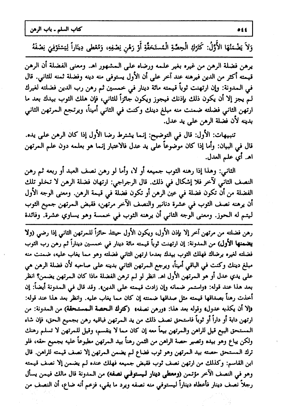 الثاني: وهذا إذا رهنه الثوب جميعه أولا، وأما لو رهن نصف العبد أو ربعه ثم رهن النصف الثاني لآخر فلا إشكال في ذلك قال الرجراجي: ارتهان فضلة الرهن لا تخلو تلك الفضلة من أن تكون فضلة في عين الرهن أو تكون فضلة في قيمة الرهن ومعنى الوجه الأول أن يرهنه نصف الثوب في عشرة دنانير، والنصف الآخر مرتهن فقبض المرتهن جميع الثوب ليتم له الحوز ومعنى الوجه الثاني: أن يرهنه الثوب في خمسة وهو يساوي عشرة. وفائدة