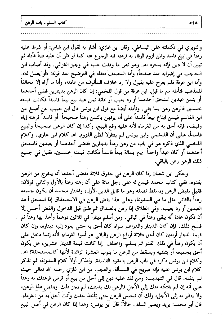 والنويري في تكملته على البساطي وقال ابن غازي أشار به لقول ابن شاس أو شرط عليه رهنا في بيع فاسد وظن لزوم الوفاء به فرهنه فله الرجوع عنه كما لو ظن أن عليه دينا فأداه ثم تبين أن لا دين فإنه يسترد ا هـ. وهو نص ما وقفت عليه في وجيز الغزالي وقد أصاب ابن الحاجب في إضرابه عنه صفحا، وأما المصنف فنقله في التوضيح عند قوله: "أو يعمل له" وأما ابن عرفة فلم يعرج عليه بقبول ولا رد خلاف المألوف من عادته وأنا ما أراه إلا مخالفا للمذهب فتأمله مع ما قبل ابن عرفة من قول اللخمي إن كان الرهن بدينارين قضى أحدهما أو بثمن عبدين استحق أحدهما أو رد بعيب أو بمائة ثمن عبد بيع بيعا فاسدا فكانت قيمته خمسين فالرهن رهن بما بقي وتأمله أيضا مع قول ابن يونس قال ابن حبيب عن أصبغ عن ابن القاسم فيمن ابتاع بيعا فاسدا على أن يرتهن بالثمن رهنا صحيحا أو فاسدا فرهنه إياه وقبضه: فإنه أحق به من الغرماء؛ لأنه عليه وقع البيع. وكذا إن كان الرهن صحيحا والبيع فاسدا على أن اللخمي وابن يونس لم يتنازلا لظن اللزوم ا هـ. كلام ابن غازي وكلام اللخمي الذي ذكره هو في: باب من رهن رهنا بدينارين فقضى أحدهما أو بعبدين فاستحق أحدهما أو كان عبدا واحدا بيع بمائة بيعا فاسدا فكانت قيمته خمسين فقيل في جميع ذلك الرهن رهن بالباقي.