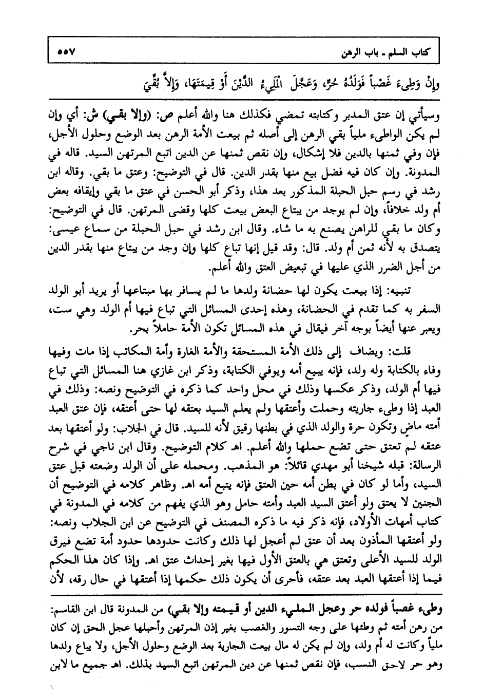 وسيأتي إن عتق المدبر وكتابته تمضي فكذلك هنا والله أعلم. ص: (والأبقى) ش: أي وإن لم يكن الواطئ مليا بقي الرهن إلى أصله ثم بيعت الأمة الرهن بعد الوضع وحلول الأجل فإن وفى ثمنها بالدين فلا إشكال وإن نقص ثمنها عن الدين اتبع المرتهن السيد قاله في المدونة، وإن كان فيه فضل بيع منها بقدر الدين قال في التوضيح: وعتق ما بقي وقاله ابن رشد في رسم حبل الحبلة المذكور بعد هذا، وذكر أبو الحسن في عتق ما بقي وإيقافه بعض أم ولد خلافا وإن لم يوجد من يبتاع البعض بيعت كلها وقضى المرتهن قال في التوضيح: وكان ما بقي للراهن يصنع به ما شاء، وقال ابن رشد في حبل الحبلة من سماع عيسى يتصدق به؛ لأنه ثمن أم ولد قال وقد قيل إنها تباع كلها وإن وجد من يبتاع منها بقدر الدين من أجل الضرر الذي عليها في تبعيض العتق والله أعلم.