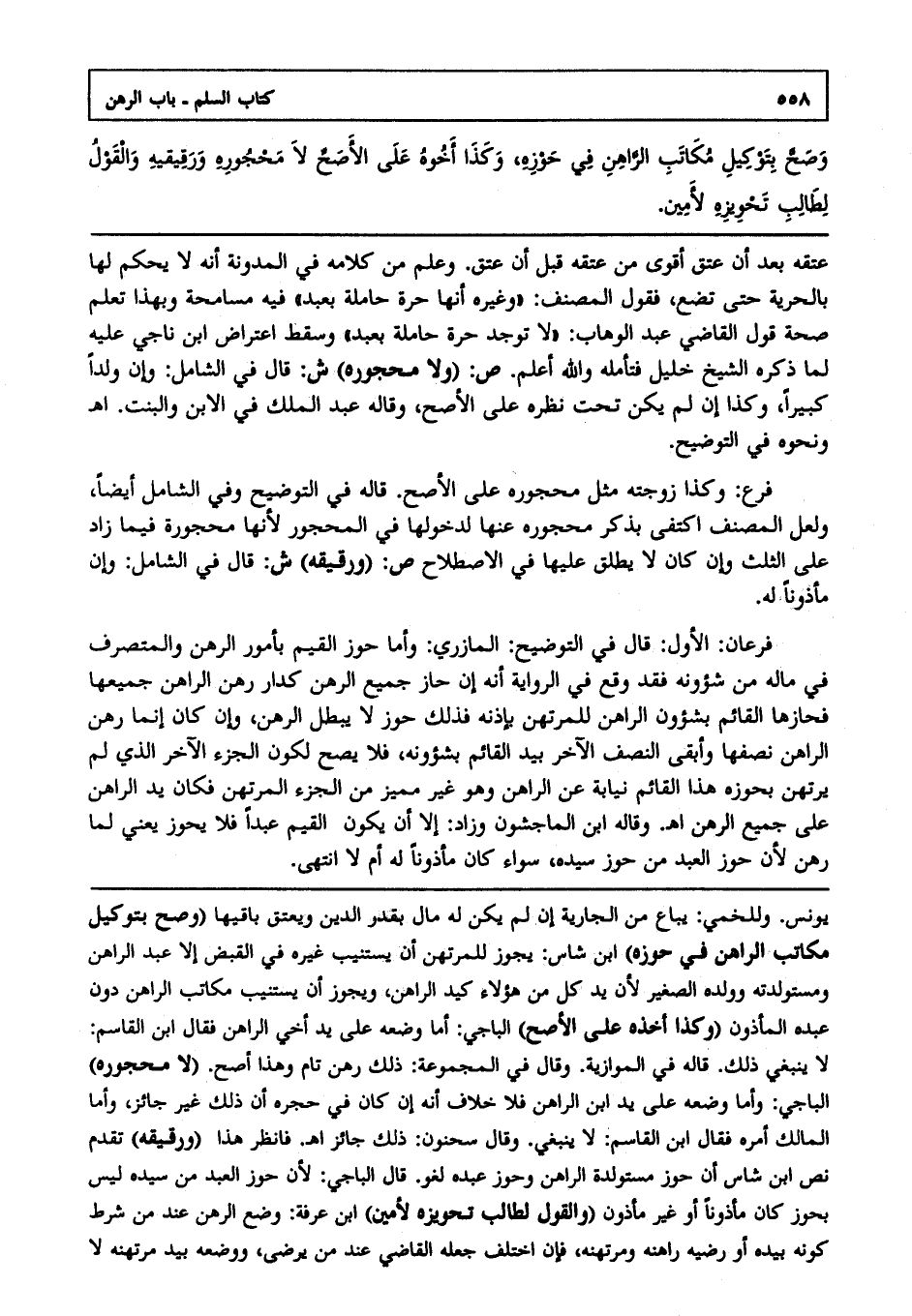 عتقه بعد أن عتق أقوى من عتقه قبل أن عتق وعلم من كلامه في المدونة أنه لا يحكم لها بالحرية حتى تضع فقول المصنف "وغيره إنها حرة حاملة بعبد" فيه مسامحة، وبهذا تعلم صحة قول القاضي عبد الوهاب "لا توجد حرة حاملة بعبد" وسقط اعتراض ابن ناجي عليه لما ذكره الشيخ خليل فتأمله والله أعلم. ص: (ولا محجوره) ش: قال في الشامل: وإن ولدا كبيرا وكذا إن لم يكن تحت نظره على الأصح وقاله عبد الملك في الابن والبنت ا هـ. ونحوه في التوضيح.