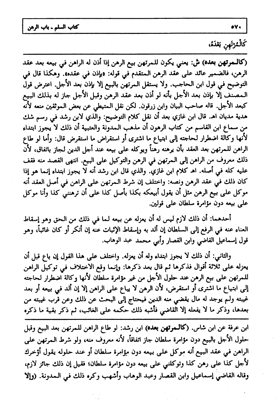 والثاني: أن ذلك لا يجوز ابتداء وله أن يعزله واختلف على هذا القول إن باع قبل أن يعزله على ثلاثة أقوال فذكرها، ثم قال بعد ذكرها: وإنما وقع الاختلاف في توكيل الراهن للمرتهن على بيع الرهن عند حلول الأجل من غير مؤامرة سلطان؛ لأنها وكالة اضطرار لحاجته إلى ابتياع ما اشترى أو استقرض؛ لأن الرهن لا يباع على الراهن إلا إن ألد في بيعه أو بعد غيبته، ولم يوجد له مال يقضي منه الدين فيحتاج إلى البحث عن ذلك وعن قرب غيبته من بعدها وذكر ما لا يفعله إلا القاضي فأشبه ذلك حكمه على الغائب، ثم ذكر بقية ما ذكره