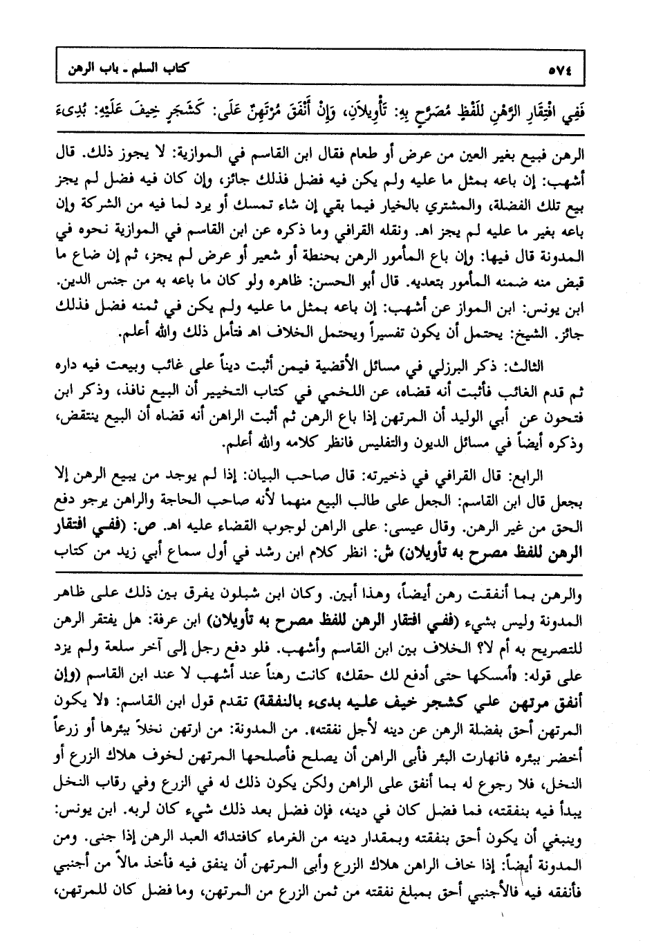 الرابع: قال القرافي في ذخيرته قال صاحب البيان: إذا لم يوجد من يبيع الرهن إلا بجعل قال ابن القاسم: الجعل على طالب البيع منهما؛ لأنه صاحب الحاجة والراهن يرجو دفع الحق من غير الرهن، وقال عيسى: على الراهن لوجوب القضاء عليه ا هـ. ص: (ففي افتقار الرهن للفظ مصرح به تأويلان) ش: انظر كلام ابن رشد في أول سماع أبي زيد من كتاب