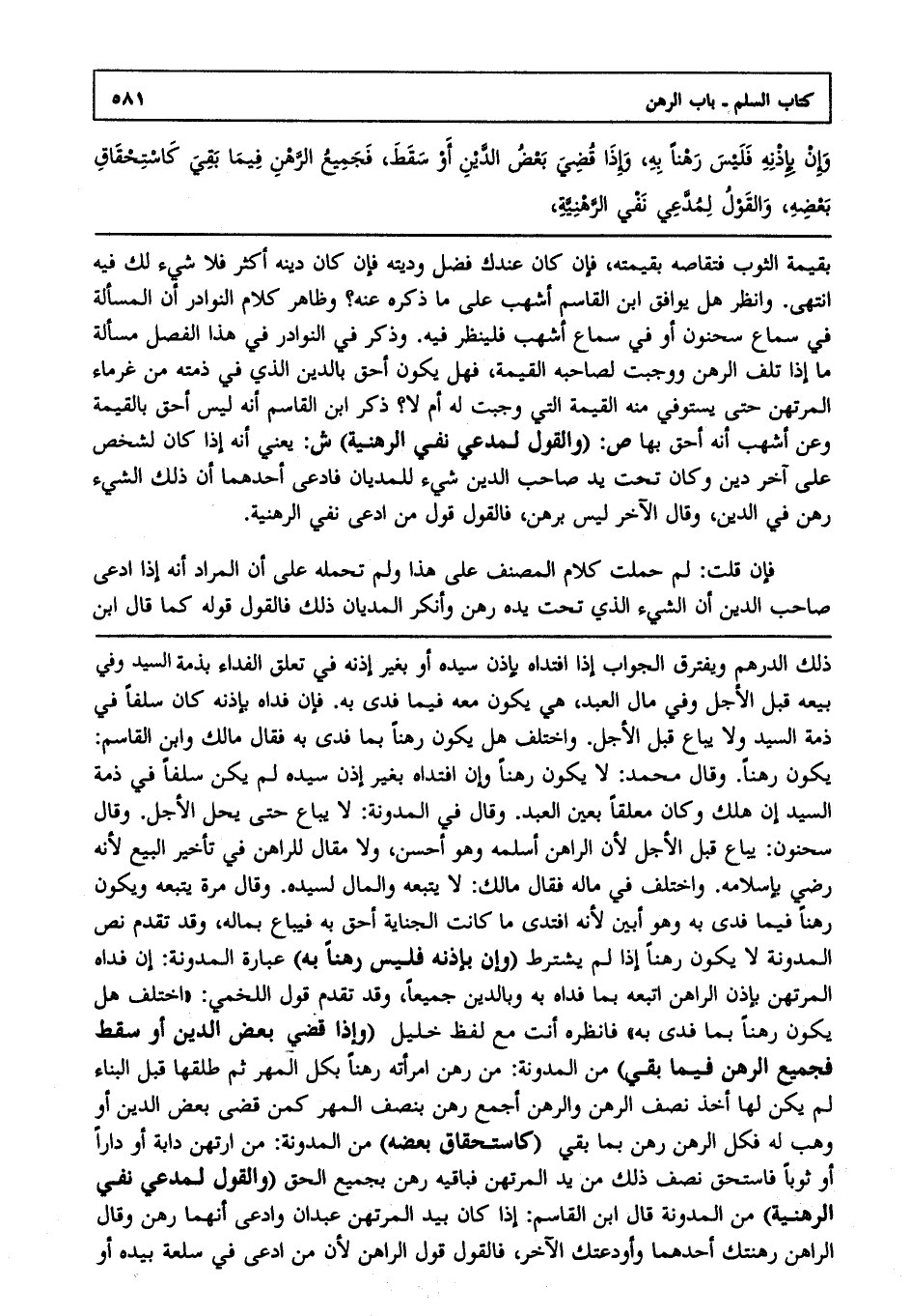 بقيمة الثوب فتقاصه بقيمته فإن كان عندك فضل وديته فإن كان دينه أكثر فلا شيء لك فيه انتهى. وانظر هل يوافق ابن القاسم أشهب على ما ذكره عنه وظاهر كلام النوادر أن المسألة في سماع سحنون، أو في سماع أشهب فلينظر فيه، وذكر في النوادر في هذا الفصل مسألة ما إذا تلف الرهن ووجبت لصاحبه القيمة فهل يكون أحق بالدين الذي في ذمته من غرماء المرتهن حتى يستوفي منه القيمة التي وجبت له أم لا ذكر عن ابن القاسم أنه ليس أحق بالقيمة وعن أشهب أنه أحق بها.ص: (والقول لمدعي نفي الرهنية) ش: يعني أنه إذا كان لشخص على آخر دين وكان تحت يد صاحب الدين شيء للمديان فادعى أحدهما أن ذلك الشيء رهن في الدين، وقال الآخر: ليس برهن فالقول قول من ادعى نفي الرهنية.