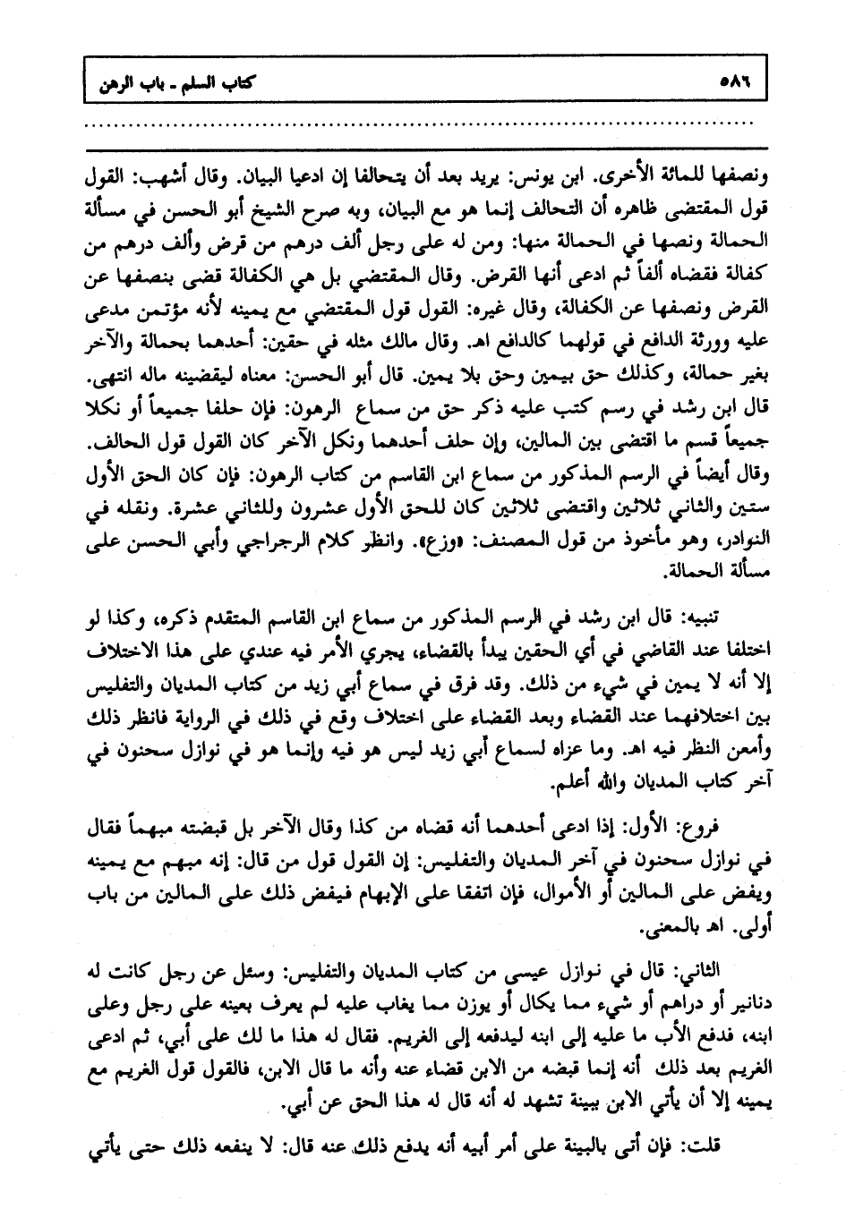 تنبيه: قال ابن رشد في الرسم المذكور من سماع ابن القاسم المتقدم ذكره، وكذا: لو اختلفا عند القاضي في أي الحقين يبدأ بالقضاء يجري الأمر فيه عندي على هذا الاختلاف إلا أنه لا يمين في شيء من ذلك، وقد فرق في سماع أبي زيد من كتاب المديان والتفليس بين اختلافهما عند القضاء وبعد القضاء على اختلاف وقع في ذلك في الرواية فانظر ذلك وأمعن النظر فيه ا هـ. وما عزاه لسماع أبي زيد ليس هو فيه وإنما هو في نوازل سحنون في آخر كتاب المديان والله أعلم.