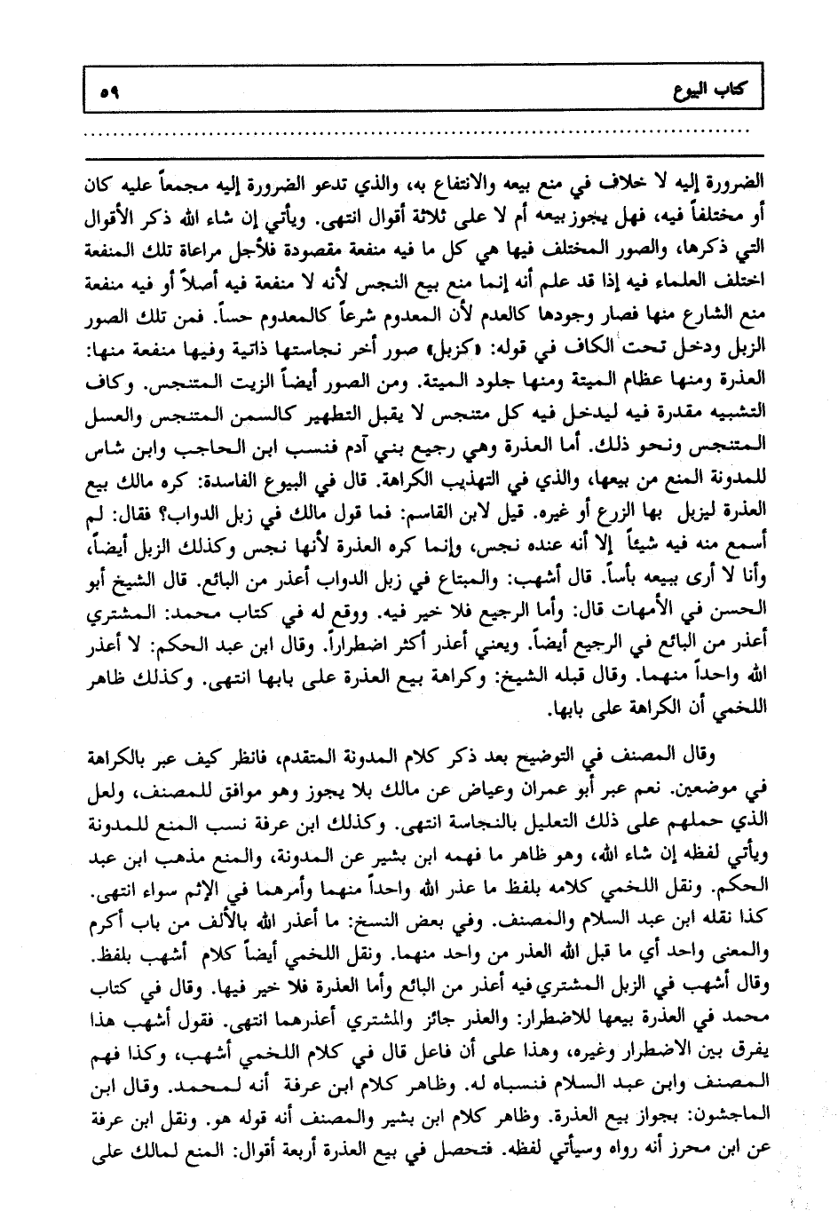 وقال المصنف في التوضيح: بعد ذكر كلام المدونة المتقدم فانظر كيف عبر بالكراهة في موضعين نعم عبر أبو عمران وعياض عن مالك بلا يجوز، وهو موافق للمصنف، ولعل الذي حملهم على ذلك التعليل بالنجاسة انتهى. وكذلك ابن عرفة نسب المنع للمدونة ويأتي لفظه إن شاء الله، وهو ظاهر ما فهمه ابن بشير عن المدونة، والمنع مذهب ابن عبد الحكم، ونقل اللخمي كلامه بلفظ ما عذر الله واحدا منهما، وأمرهما في الإثم سواء انتهى. كذا نقله ابن عبد السلام والمصنف، وفي بعض النسخ ما أعذر الله بالألف من باب أكرم، والمعنى واحد أي ما قبل الله العذر من واحد منهما ونقل اللخمي أيضا كلام أشهب بلفظ، وقال أشهب: في الزبل، والمشتري فيه أعذر من البائع، وأما العذرة فلا خير فيها، وقال: في كتاب محمد في العذرة بيعها للاضطرار والعذر جائز، والمشتري أعذرهما انتهى فقول أشهب هذا يفرق بين الاضطرار، وغيره، وهذا على أن فاعل قال في كلام اللخمي أشهب، وكذا فهم المصنف وابن عبد السلام فنسباه له، وظاهر كلام ابن عرفة أنه لمحمد، وقال ابن الماجشون: "بجواز بيع العذرة" وظاهر كلام ابن بشير والمصنف أنه قوله هو، ونقل ابن عرفة عن ابن محرز أنه رواه، وسيأتي لفظه فتحصل في بيع العذرة أربعة أقوال: المنع لمالك على