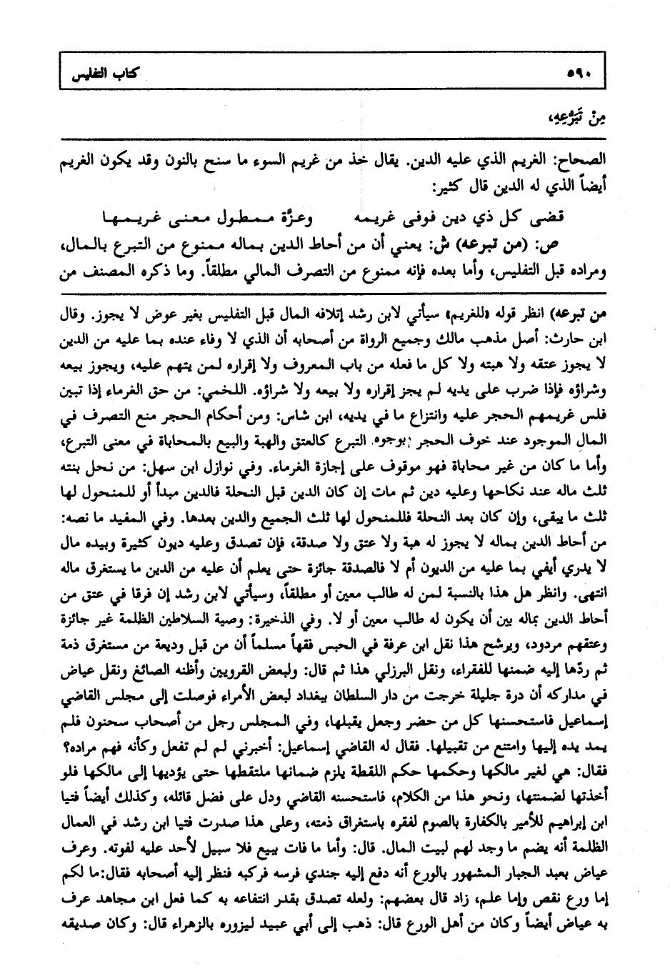 ص: (من تبرعه) ش: يعني أن من أحاط الدين بماله ممنوع من التبرع بالمال ومراده قبل التفليس، وأما بعده فإنه ممنوع من التصرف المالي مطلقا وما ذكره المصنف من