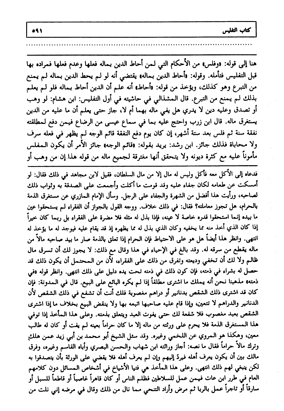 هنا إلى قوله "وفلس" من الأحكام التي لمن أحاط الدين بماله فعلها وعدم فعلها فمراده بها قبل التفليس فتأمله وقوله: أحاط الدين بماله يقتضي أنه لو لم يحط الدين بماله لم يمنع من التبرع، وهو كذلك ويؤخذ من قوله: أحاط أنه علم أن الدين أحاط بماله فلو لم يعلم بذلك لم يمنع من التبرع قال المشذالي في حاشيته في أول التفليس ابن هشام: لو وهب، أو تصدق وعليه دين لا يدري هل يفي ماله بهما أم لا جاز حتى يعلم أن ما عليه من الدين يستغرق ماله قاله ابن زرب واحتج عليه بما في سماع عيسى من الرضاع فيمن دفع لمطلقته نفقة سنة، ثم فلس بعد ستة أشهر إن كان يوم دفع النفقة قائم الوجه لم يظهر في فعله سرف ولا محاباة، فذلك جائز ابن رشد يريد بقوله: "قائم الوجه": جائز الأمر. أن يكون المفلس مأمونا عليه مع كثرة ديونه ولا يتحقق أنها مغترقة لجميع ماله فيقوم من قوله هذا: أن من وهب، أو
