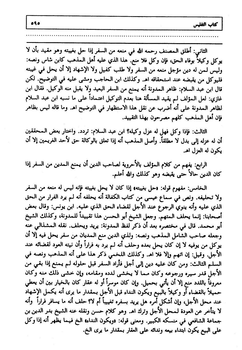 الخامس: مفهوم قوله حل بغيبته إذا كان لا يحل بغيبته فإنه ليس له منعه من السفر ولا تحليفه ونص في سماع عيسى من كتاب الكفالة أنه يحلفه أنه لم يرد الفرار من الحق الذي عليه، وأنه ينوي الرجوع عند الأجل لقضاء الحق الذي عليه. ابن يونس، وقال بعض أصحابنا: إنما يحلف المتهم وجعل الشيخ أبو الحسن هذا تقييدا للمدونة وكذلك الشيخ أبو محمد قال في مختصره. بعد أن ذكر لفظ المدونة: يريد ويحلف نقله المشذالي عنه وجعله صاحب الشامل المذهب، ونصه: "ولذي الدين منع المديان من سفر يحل فيه إلا أن يوكل من يوفيه. لا إن كان يحل بعده وحلف أنه لم يرد به فرارا، وأن نيته العود لقضائه عند الأجل وقيل إن اتهم وإلا فلا" ا هـ. وكذلك اللخمي ذكر هذا على أنه المذهب ونصه في السلم الثالث "ومن كان عليه دين إلى أجل فأراد السفر قبل حلوله لم يمنع إذا بقي من الأجل قدر سيره ورجوعه وكان مما لا يخشى لدده ومقامه، وإن خشي ذلك منه وكان معروفا باللدد منع إلا أن يأتي بحميل، وإن كان موسرا أو له عقار كان بالخيار بين أن يعطي حميلا بالقضاء، أو وكيلا بالبيع ويكون النداء قبل الأجل بمقدار ما يرى أنه يكمل الإشهاد عند محل الأجل، وإن أشكل أمره هل يريد بسفره تغييبا، أم لا حلف أنه ما يسافر فرارا، وأنه لا يتأخر عن العودة لمحل الأجل وترك" ا هـ. وهو كلام حسن ونقله عنه الشيخ بدر الدين بن جماعة الشافعي في منسكه. الكبير ومعنى قوله: "ويكون النداء" إلخ فيما يظهر أنه إذا وكل على البيع يكون ابتداء بيعه وندائه على العقار بمقدار ما يرى إلخ.
