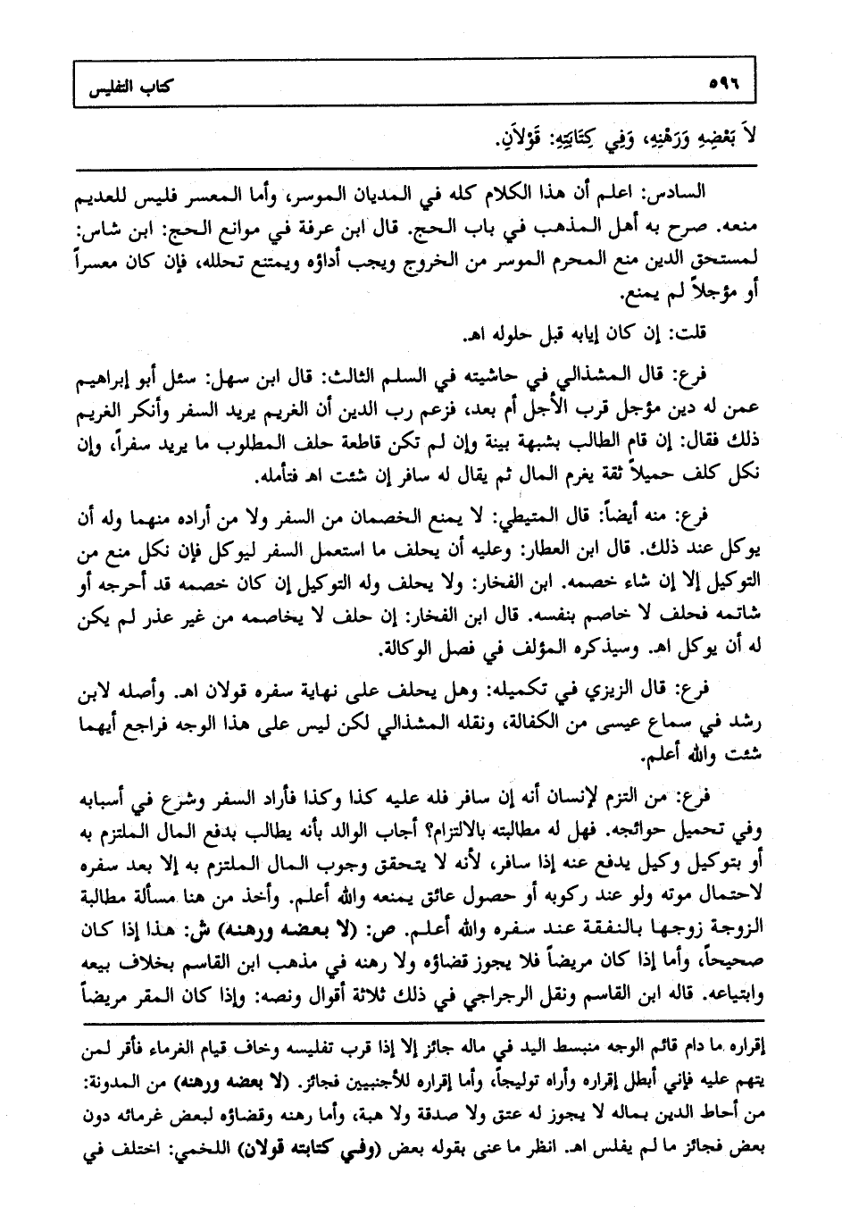 السادس: اعلم أن هذا الكلام كله في المديان الموسر، وأما المعسر فليس للعديم منعه صرح به أهل المذهب في باب الحج قال ابن عرفة في موانع الحج ابن شاس: "لمستحق الدين منع المحرم الموسر من الخروج ويجب أداؤه ويمتنع تحلله فإن كان معسرا، أو مؤجلا لم يمنع".