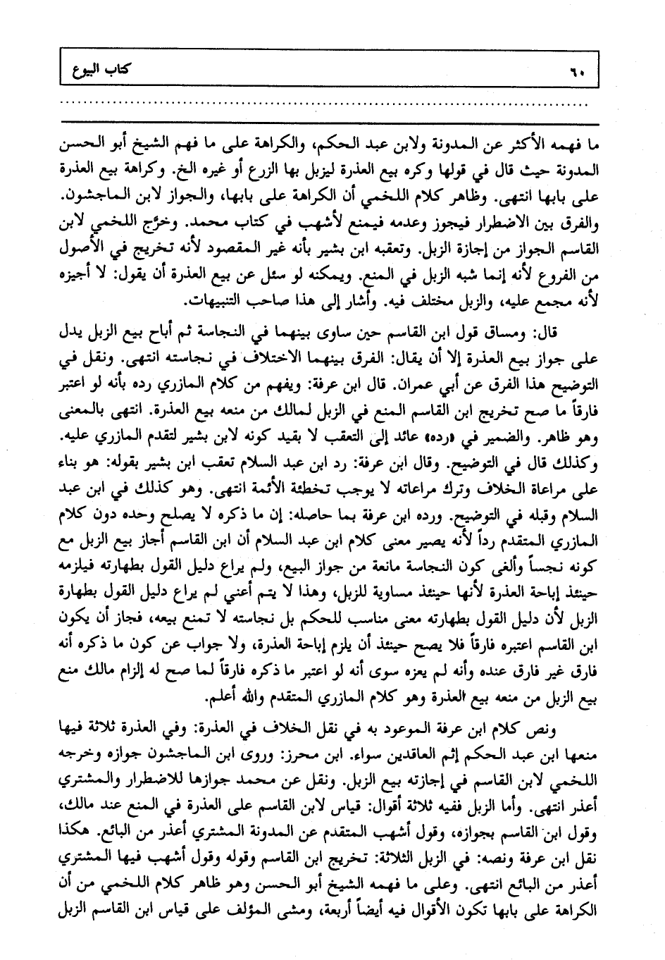 ونص كلام ابن عرفة الموعود به في نقل الخلاف في العذرة، وفي العذرة ثلاثة فيها منعها ابن عبد الحكم أثم العاقدين سواء ابن محرز وروى ابن الماجشون جوازه وخرجه اللخمي لابن القاسم في إجازته بيع الزبل، ونقل عن محمد جوازها للاضطرار والمشتري أعذر انتهى. وأما الزبل ففيه ثلاثة أقوال: قياس لابن القاسم على العذرة في المنع عند مالك، وقول ابن القاسم بجوازه، وقول أشهب المتقدم عن المدونة المشتري أعذر من البائع هكذا نقل ابن عرفة، ونصه في الزبل الثلاثة تخريج ابن القاسم، وقوله وقول أشهب فيها المشتري أعذر من البائع انتهى. وعلى ما فهمه الشيخ أبو الحسن، وهو ظاهر كلام اللخمي من أن الكراهة على بابها تكون الأقوال فيه أيضا أربعة، ومشى المؤلف على قياس ابن القاسم الزبل