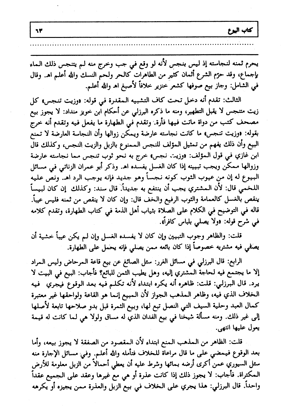 الثالث: تقدم أنه دخل تحت كاف التشبيه المقدرة في قوله، وزيت تنجس كل "زيت متنجس" لا يقبل التطهير، ومنه ما ذكره البرزلي عن أحكام ابن خويز منداد، ولا يجوز بيع مصحف كتب من دواة ماتت فيها فأرة وتقدم في الطهارة ما يفعل فيه وتقدم أنه خرج بقوله، وزيت تنجس ما كانت نجاسته عارضة ويمكن زوالها، وأن النجاسة العارضة لا تمنع البيع، وأن ذلك يفهم من تمثيل المؤلف للنجس الممنوع بالزبل والزيت النجس، وكذلك قال ابن غازي في قول المؤلف: "وزيت تنجس" خرج به نحو ثوب تنجس مما نجاسته عارضة وزوالها ممكن، ويجب تبيينه إذا كان الغسل يفسده ا هـ. وذكر أبو عمران الزناني في مسائل البيوع له أن من عيوب الثوب كونه نجسا، وهو جديد فإنه يوجب الرد ا هـ. ونص عليه اللخمي قال: لأن المشتري يجب أن ينتفع به جديدا قال سند: وكذلك إن كان لبيسا ينقص بالغسل كالعمامة والثوب الرفيع، والخف قال: وإن كان لا ينقص من ثمنه فليس عيبا قاله في التوضيح في الكلام على الصلاة بثياب أهل الذمة في كتاب الطهارة وتقدم كلامه في شرح قوله:"ولا يصلي بلباس كافر".