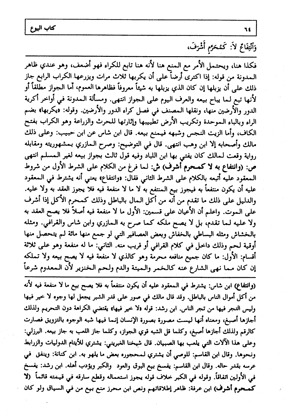 فكذا هنا ويحتمل الأمر مع المنع هنا؛ لأنه هنا تابع للكراء فهو أضعف، وهو عندي ظاهر المدونة من قوله إذا اكترى أرضا على أن يكربها ثلاث مرات، ويزرعها الكراب الرابع جاز ذلك على أن يزبلها إن كان الذي يزبلها به شيئا معروفا فظاهرها العموم إما الجواز مطلقا أو؛ لأنها تبع لما يباح بيعه، والعرف اليوم على الجواز انتهى. ومسألة المدونة في أواخر أكرية الدور والأرضين منها، ونقلها المصنف في فصل كراء الدور والأرضين، وقوله يكربها بضم الراء، وبالباء الموحدة وتكريب الأرض تطييبها، وإثارتها للحرث والزراعة، وهو الكراب بفتح الكاف، وأما الزيت النجس، وشبهه فيمنع بيعه قال ابن شاس: عن ابن حبيب، وعلى ذلك مالك، وأصحابه إلا ابن وهب انتهى قال في التوضيح: وصرح المازري بمشهوريته ومقابله رواية وقعت لمالك كان يفتي بها ابن اللباد وفيه قول ثالث بجواز بيعه لغير المسلم انتهى.ص: (وانتفاع به لا كمحرم أشرف) ش لما فرغ من الكلام على الشرط الأول من شروط المعقود عليه أتبعه بالكلام على الشرط الثاني فقال "وانتفاع" يعني أنه يشترط في المعقود عليه أن يكون منتفعا به فيجوز بيع المنتفع به لا ما لا منفعة فيه فلا يجوز العقد به، ولا عليه، والدليل على ذلك ما تقدم من أنه من أكل المال بالباطل، وذلك كمحرم الأكل إذا أشرف على الموت، واعلم أن الأعيان على قسمين: الأول ما لا منفعة فيه أصلا فلا يصح العقد به، ولا عليه لما تقدم بل لا يصح ملكه كما صرح به المازري وابن شاس والقرافي، ومثله بالخشاش، ومثله البساطي بالخفاش، وبعض العصافير التي لو جمع منها مائة لم يتحصل منها أوقية لحم، وذلك داخل في كلام القرافي أو قريب منه الثاني ما له منفعة، وهو على ثلاثة: أقسام الأول ما كان جميع منافعه محرمة، وهو كالذي لا منفعة فيه لا يصح بيعه، ولا تملكه إن كان مما نهى الشارع عنه كالخمر، والميتة والدم ولحم الخنزير؛ لأن المعدوم شرعا