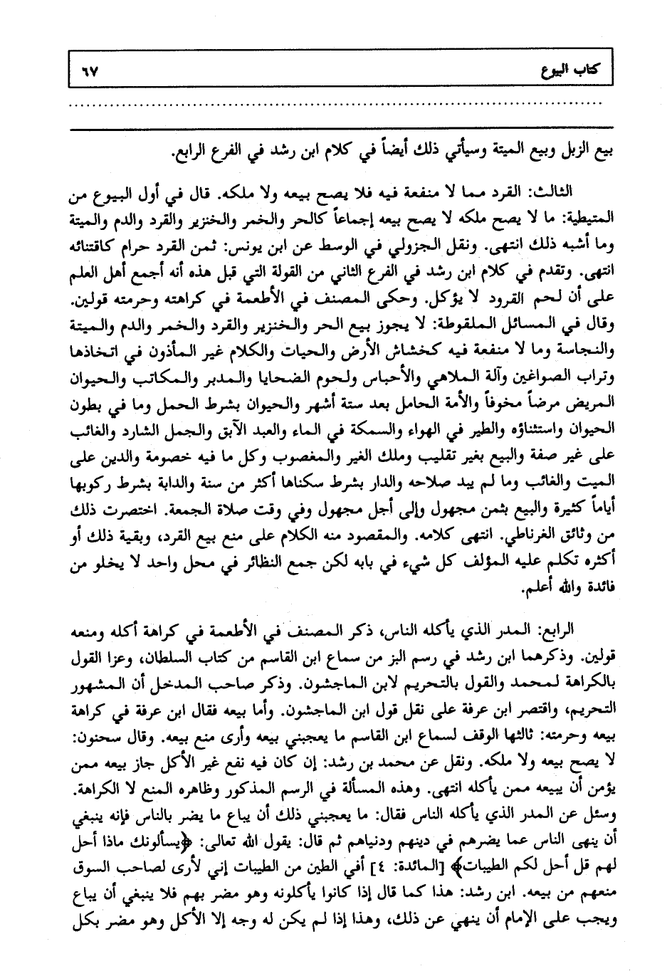 بيع الزبل، وبيع الميتة، وسيأتي ذلك أيضا في كلام ابن رشد في الفرع الرابع.
