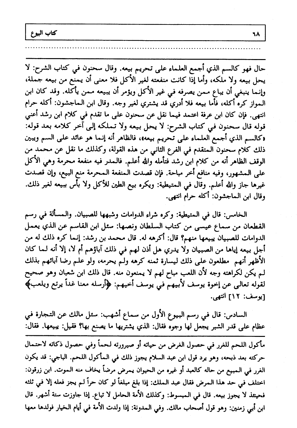 السادس: قال في رسم البيوع الأول من سماع أشهب: سئل مالك عن التجارة في عظام على قدر الشبر يجعل لها وجوه فقال الذي يشتريها ما يصنع بها؟ فقيل يبيعها فقال: