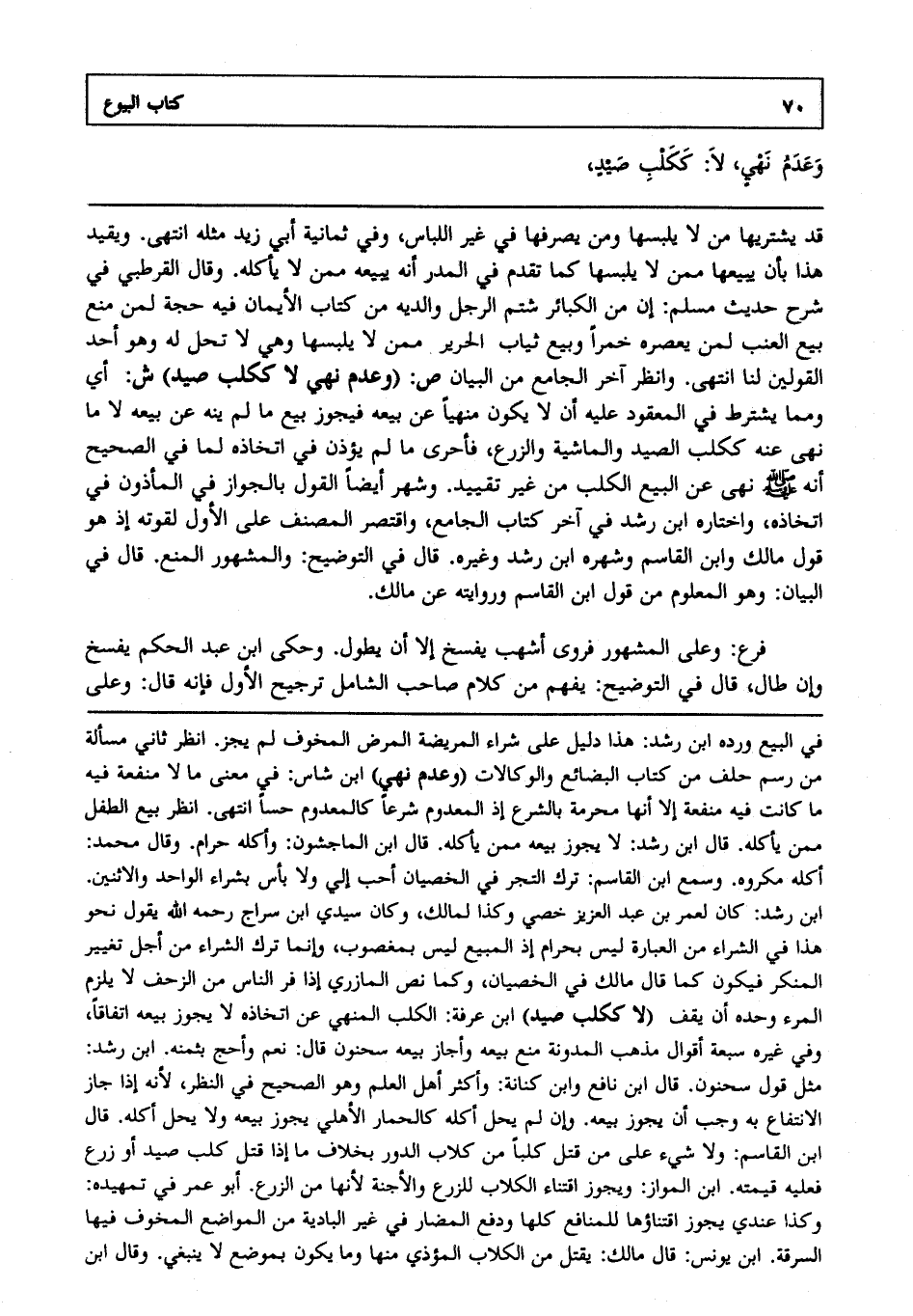 قد يشتريها من لا يلبسها، ومن يصرفها في غير اللباس، وفي ثمانية أبي زيد مثله انتهى. ويقيد هذا بأن يبيعها ممن لا يلبسها كما تقدم في المدر أنه يبيعه ممن لا يأكله، وقال: القرطبي في شرح حديث مسلم إن من الكبائر شتم الرجل والديه من كتاب الإيمان فيه حجة لمن منع بيع العنب لمن يعصره خمرا، وبيع ثياب الحرير ممن لا يلبسها، وهي لا تحل له، وهو أحد القولين لنا انتهى.، وانظر آخر الجامع من البيان ص: (وعدم نهي لا ككلب صيد) ش: أي، ومما يشترط في المعقود عليه أن لا يكون منهيا عن بيعه فيجوز بيع ما لم ينه عن بيعه لا ما نهي عنه ككلب الصيد، والماشية، والزرع فأحرى ما لم يؤذن في اتخاذه لما في الصحيح أنه صلى الله عليه وسلم نهى عن بيع الكلب من غير تقييد، وشهر أيضا القول بالجواز في المأذون في اتخاذه، واختاره ابن رشد في آخر كتاب الجامع واقتصر المصنف على الأول لقوته إذ هو قول مالك، وابن القاسم، وشهره ابن رشد، وغيره قال في التوضيح :، والمشهور المنع قال في البيان: وهو المعلوم من قول ابن القاسم وروايته عن مالك.