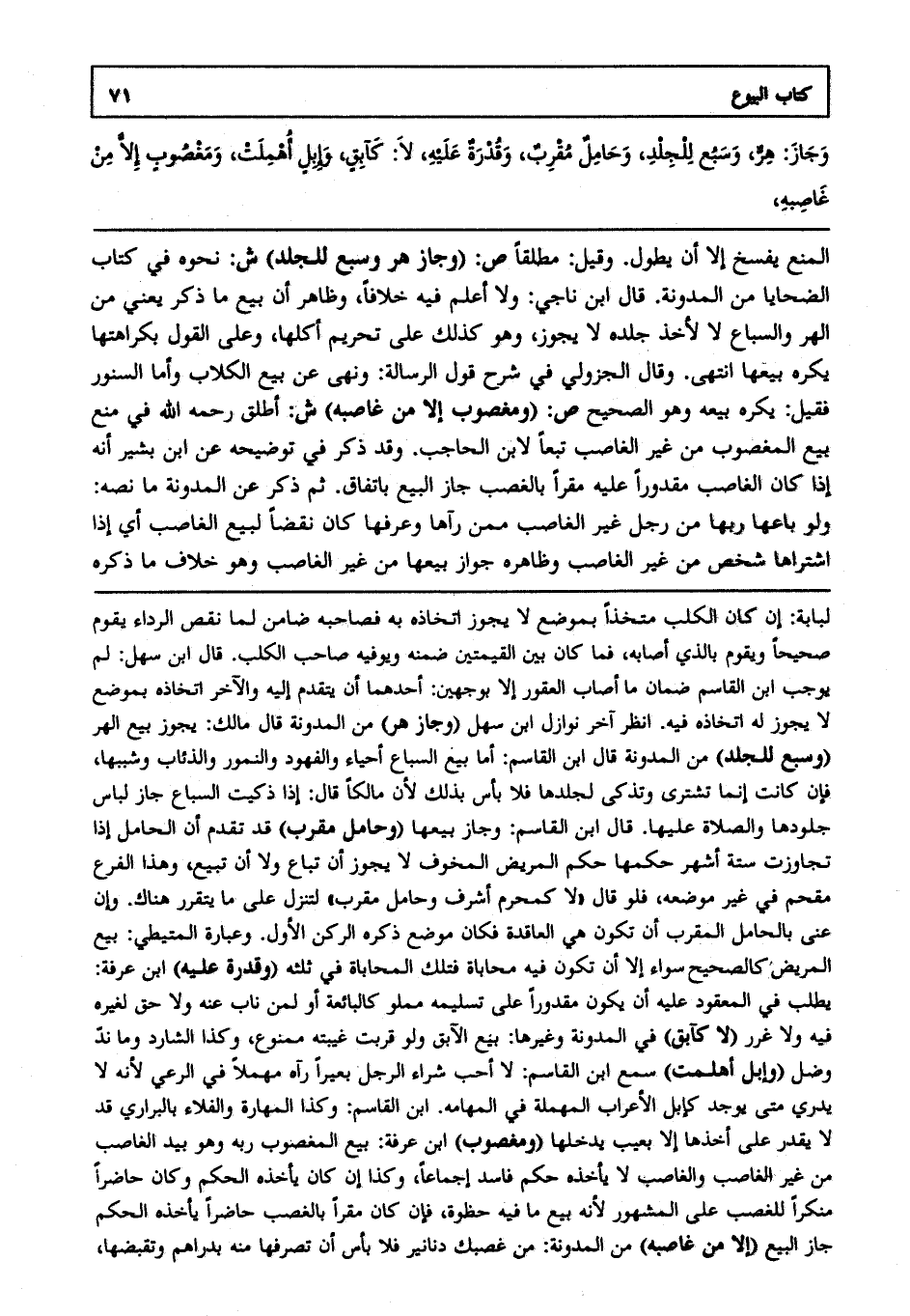 المنع يفسخ إلا أن يطول، وقيل مطلقا. ص: (وجاز هر، وسبع للجلد) ش: نحوه في كتاب الضحايا من المدونة قال ابن ناجي: ولا أعلم فيه خلافا، وظاهره أن بيع ما ذكر يعني من الهر والسباع لا لأخذ جلده لا يجوز وهو كذلك على تحريم أكلها، وعلى القول بكراهتها يكره بيعها انتهى. وقال الجزولي في شرح قول الرسالة: ونهى عن بيع الكلاب، وأما السنور فقيل يكره بيعه، وهو الصحيح ص: (ومغصوب إلا من غاصبه) ش: أطلق رحمه الله في منع بيع المغصوب من غير الغاصب تبعا لابن الحاجب وقد ذكر في توضيحه عن ابن بشير أنه إذا كان الغاصب مقدورا عليه مقرا بالغصب جاز البيع باتفاق ثم ذكر عن المدونة ما نصه، ولو باعها ربها من رجل غير الغاصب ممن رآها، وعرفها كان نقضا لبيع الغاصب أي إذا اشتراها شخص من غير الغاصب وظاهره جواز بيعها من غير الغاصب، وهو خلاف ما ذكره