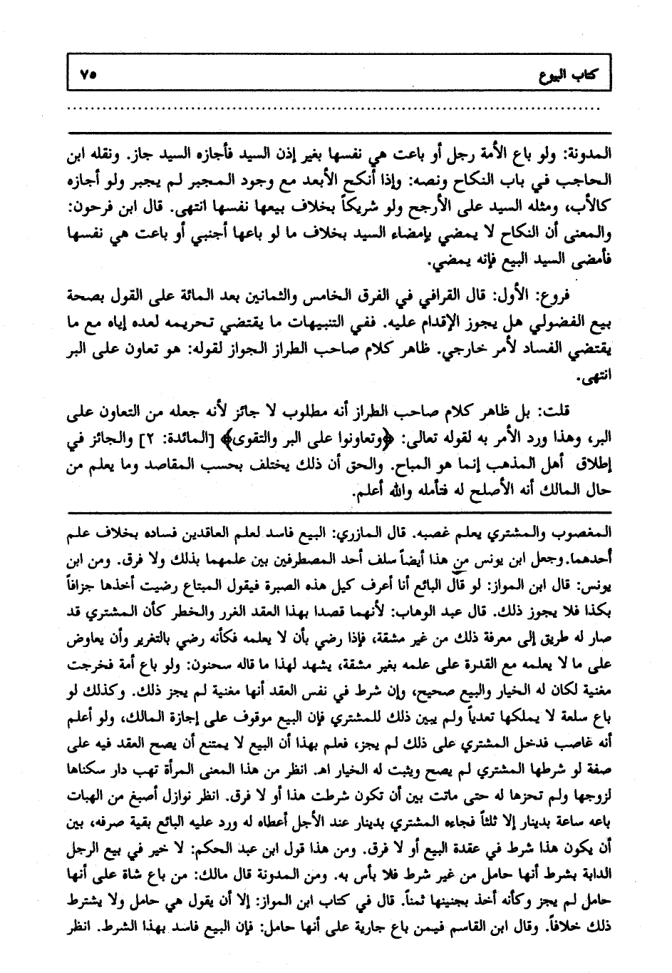 فروع الأول: قال القرافي: في الفرق الخامس والثمانين بعد المائة على القول بصحة بيع الفضولي: هل يجوز الإقدام عليه ففي التنبيهات ما يقتضي تحريمه لعده إياه مع ما يقتضي الفساد لأمر خارجي ظاهر كلام صاحب الطراز الجواز لقوله هو تعاون على البر انتهى. قلت: بل ظاهر كلام صاحب الطراز أنه مطلوب لا جائز؛ لأنه جعله من التعاون على البر، وهذا ورد الأمر به لقوله تعالى {وَتَعَاوَنُوا عَلَى الْبِرِّ وَالتَّقْوَى} [المائدة:2]، والجائز في إطلاق أهل المذهب إنما هو المباح، والحق أن ذلك يختلف بحسب المقاصد، وما يعلم من حال المالك أنه الأصلح له فتأمله والله أعلم.