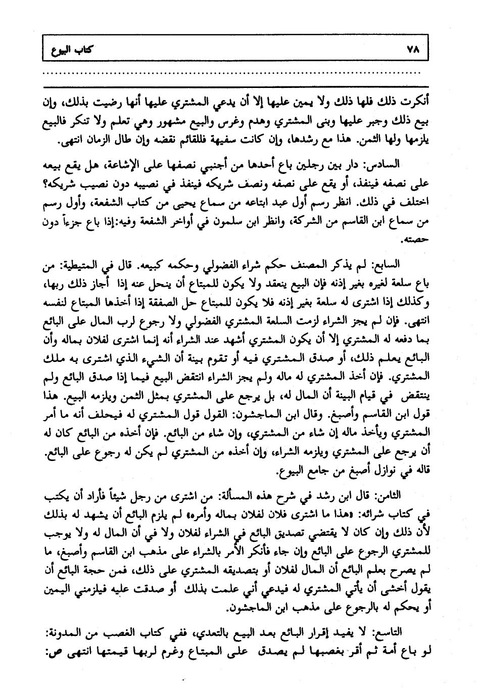 السادس: دار بين رجلين باع أحدهما من أجنبي نصفها على الإشاعة هل يقع بيعه على نصفه فينفذ أو يقع على نصفه، ونصف شريكه فينفذ في نصيبه دون نصيب شريكه ؟ اختلف في ذلك انظر رسم أول عبد ابتاعه من سماع يحيى من كتاب الشفعة، وأول رسم من سماع ابن القاسم من الشركة، وانظر ابن سلمون في أواخر الشفعة وفيه إذا باع جزءا دون حصته.