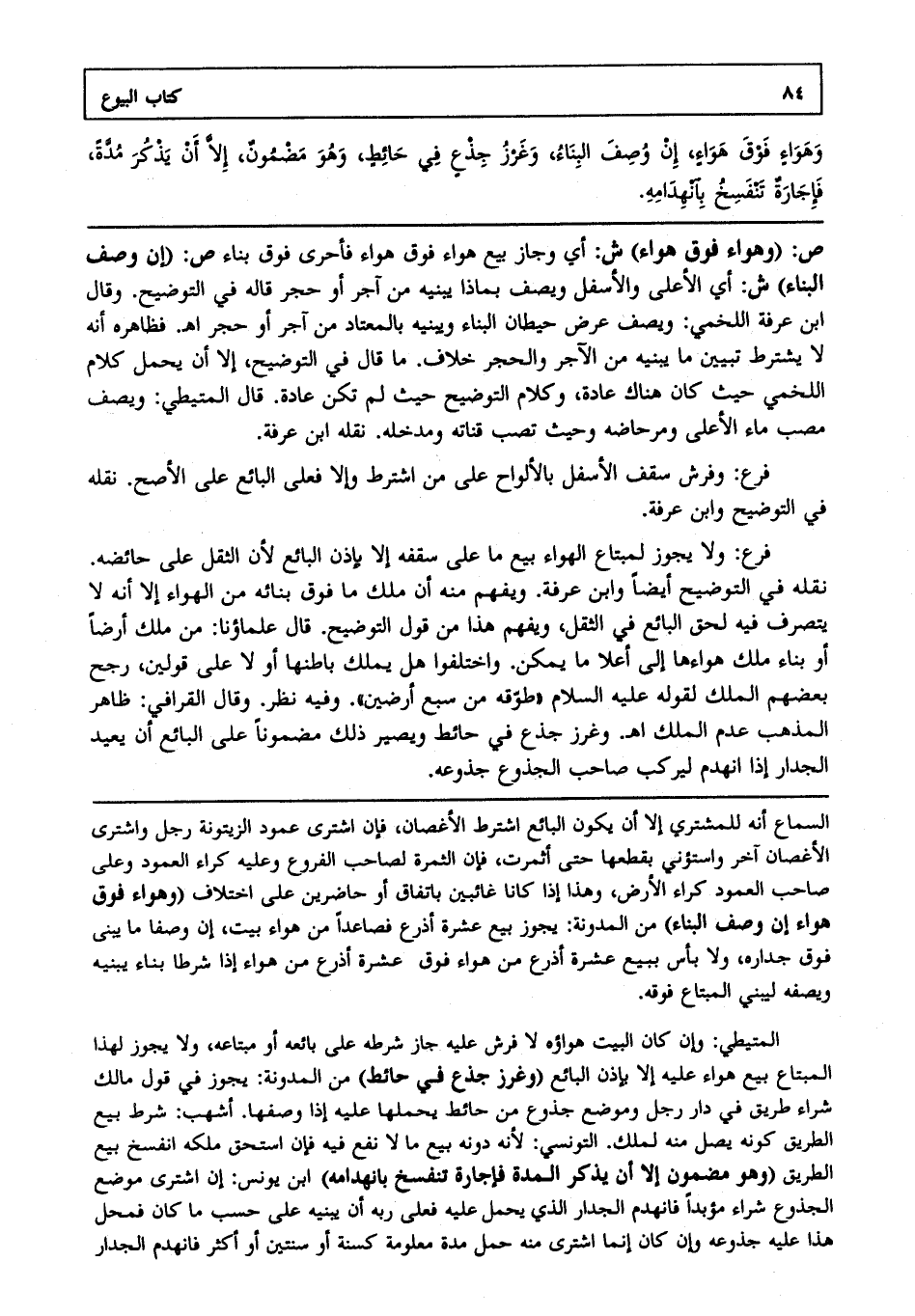 فرع :ولا يجوز لمبتاع الهواء بيع ما على سقفه إلا بإذن البائع؛ لأن الثقل على حائطه نقله في التوضيح أيضا وابن عرفة، ويفهم منه أنه ملك ما فوق بنائه من الهواء إلا أنه لا يتصرف فيه لحق البائع في الثقل، ويفهم هذا من قول التوضيح قال علماؤنا: من ملك أرضا أو بناء ملك هواءها إلى أعلى ما يمكن واختلفوا هل يملك باطنها أو لا على قولين رجح بعضهم الملك "لقوله صلى الله عليه وسلم طوقه من سبع أرضين " ، وفيه نظر، وقال القرافي: ظاهر المذهب عدم الملك ا هـ. وغرز جذع في حائط، ويصير ذلك مضمونا على البائع أن يعيد الجدار إذا انهدم ليركب صاحب الجذوع جذوعه.