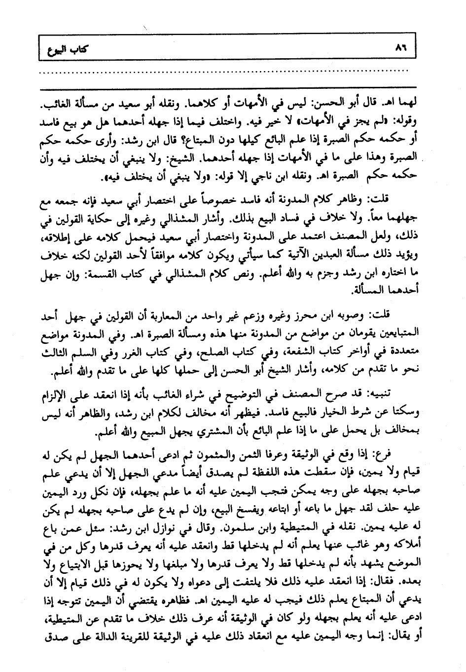 قلت: وصوبه ابن محرز، وغيره، وزعم غير واحد من المغاربة أن القولين في جهل أحد المتبايعين يقومان من مواضع من المدونة منها هذه ومسألة الصبرة ا هـ. وفي المدونة مواضع متعددة في أواخر كتاب الشفعة، وفي كتاب الصلح، وفي كتاب الغرر، وفي السلم. الثالث: نحو ما تقدم من كلامه، وأشار الشيخ أبو الحسن إلى حملها كلها على ما تقدم، والله أعلم.