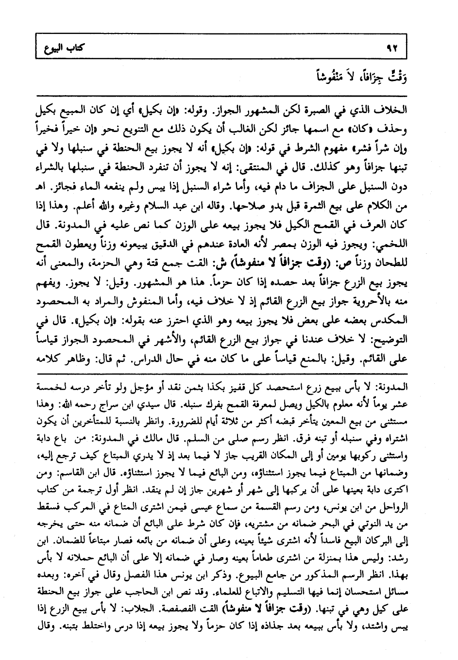الخلاف الذي في الصبرة لكن المشهور الجواز، وقوله: "إن بكيل" أي إن كان المبيع بكيل، وحذف كان مع اسمها جائز لكن الغالب أن يكون ذلك مع التنويع نحو إن خيرا فخيرا، وإن شرا فشر مفهوم الشرط في قوله إن بكيل أنه لا يجوز بيع الحنطة في سنبلها، ولا في تبنها جزافا، وهو كذلك قال في المنتقى: أنه لا يجوز أن تنفرد الحنطة في سنبلها بالشراء دون السنبل على الجزاف ما دام فيه، وأما شراء السنبل إذا يبس، ولم ينفعه الماء فجائز ا هـ من الكلام على بيع الثمرة قبل بدو صلاحها، وقاله ابن عبد السلام، وغيره، والله أعلم، وهذا إذا كان العرف في القمح الكيل فلا يجوز بيعه على الوزن كما نص عليه في المدونة قال اللخمي: ويجوز فيه الوزن بمصر؛ لأنه العادة عندهم في الدقيق يبيعونه، وزنا ويعطون القمح للطحان وزنا ص: (وقت جزافا لا منفوشا) ش: القت جمع قتة، وهي الحزمة، والمعنى أنه يجوز بيع الزرع جزافا بعد حصده إذا كان حزما هذا هو المشهور، وقيل لا يجوز، ويفهم منه بالأحروية جواز بيع الزرع إذ لا خلاف فيه، وأما المنفوش والمراد به المحصود المكدس بعضه على بعض فلا يجوز بيعه، وهو الذي احترز عنه بقوله "إن بكيل" قال في التوضيح: لا خلاف عندنا في جواز بيع الزرع القائم والأشهر في المحصود الجواز قياسا على القائم، وقيل بالمنع قياسا على ما كان منه في حال الدراس ثم قال: وظاهر كلامه