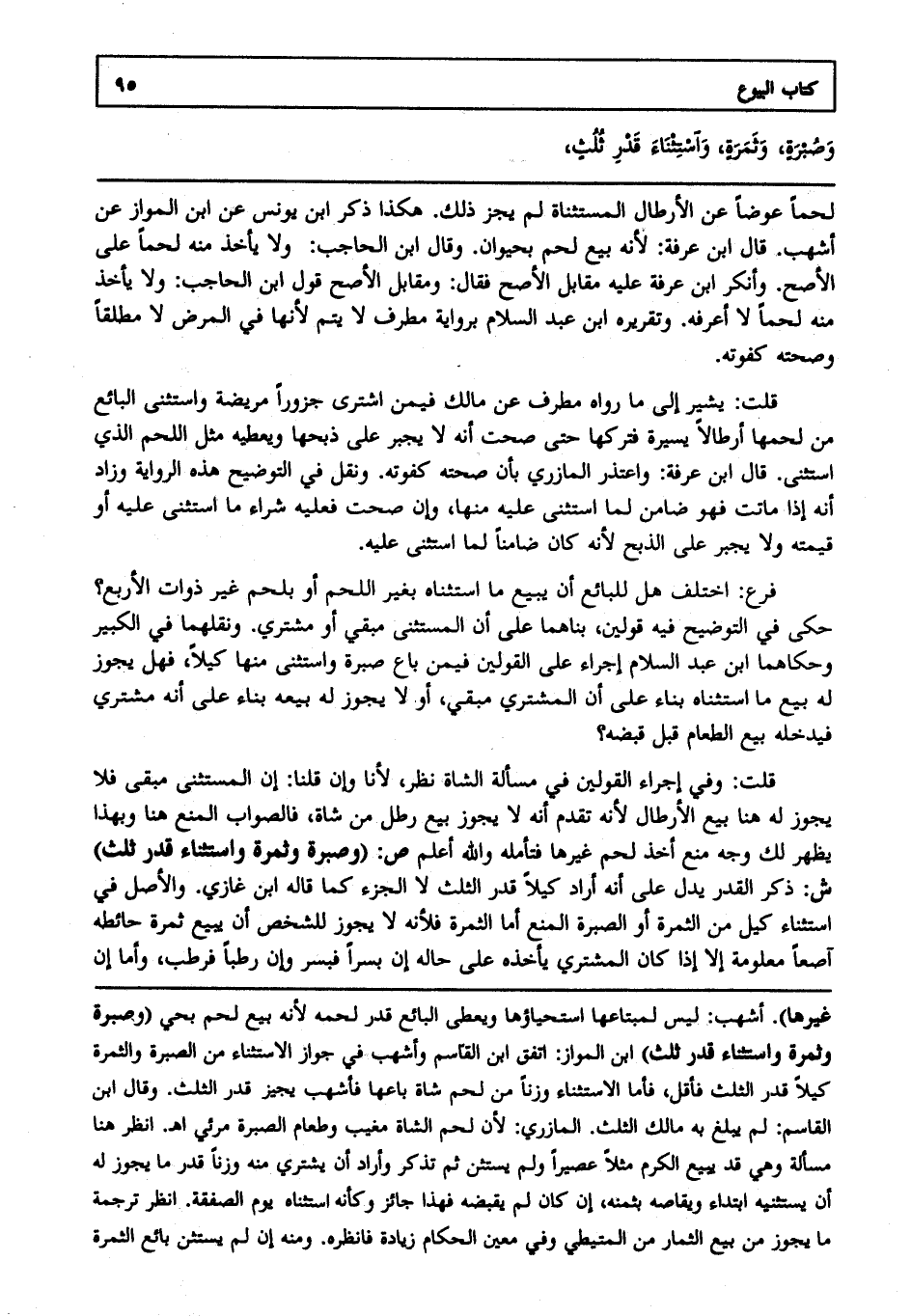 قلت: وفي إجراء القولين في مسألة الشاة نظر؛ لأنا، وإن قلنا إن المستثنى مبقى فلا يجوز له هنا بيع الأرطال؛ لأنه تقدم أنه لا يجوز بيع رطل من شاة فالصواب المنع هنا، وبهذا يظهر لك، وجه منع أخذ لحم غيرها فتأمله والله أعلم. ص: (وصبرة، وثمرة، واستثناء قدر ثلث) ش: ذكر القدر يدل على أنه أراد كيلا قدر الثلث لا الجزء كما قاله ابن غازي، والأصل في استثناء كيل من الثمرة أو الصبرة المنع أما الثمرة؛ فلأنه لا يجوز للشخص أن يبيع ثمرة حائطه آصعا معلومة إلا إذا كان المشتري يأخذه على حاله إن بسرا فبسر، وإن رطبا فرطب، وأما إن