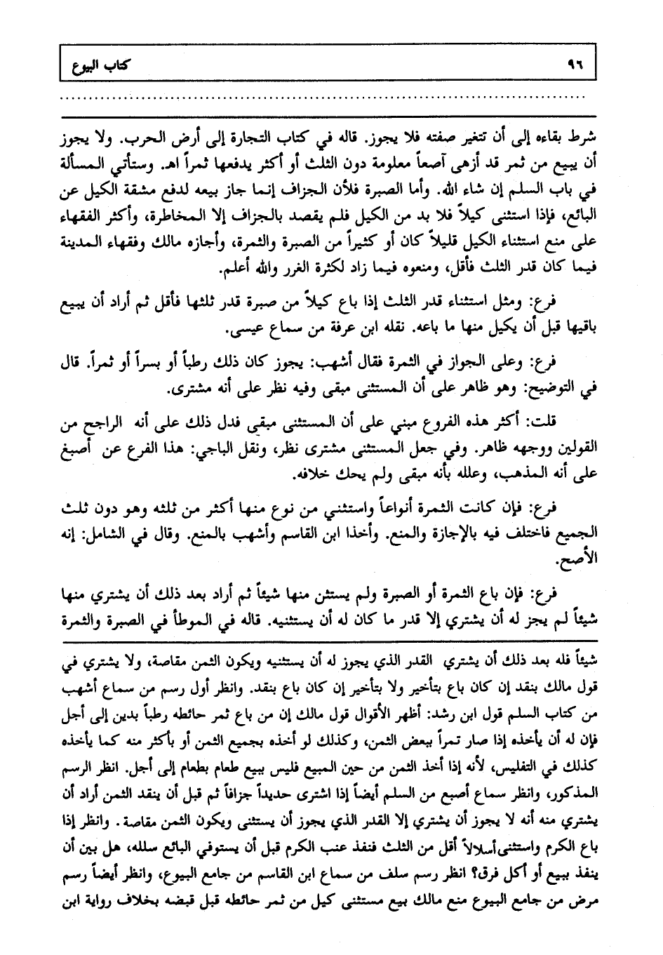 شرط بقاءه إلى أن تتغير صفته فلا يجوز قاله في كتاب التجارة إلى أرض الحرب ولا يجوز أن يبيع من ثمر قد أزهى آصعا معلومة دون الثلث أو أكثر يدفعها ثمرا ا هـ. وستأتي المسألة في باب السلم إن شاء الله، وأما الصبرة؛ فلأن الجزاف إنما جاز بيعه لدفع مشقة الكيل عن البائع فإذا استثنى كيلا فلا بد من الكيل فلم يقصدا بالجزاف إلا المخاطرة، وأكثر الفقهاء على منع استثناء الكيل قليلا كان أو كثيرا من الصبرة، والثمرة وأجازه مالك، وفقهاء المدينة فيما كان قدر الثلث فأقل ومنعوه فيما زاد لكثرة الغرر والله أعلم. فرع: ومثل استثناء قدر الثلث إذا باع كيلا من صبرة قدر ثلثها فأقل، ثم أراد أن يبيع باقيها قبل أن يكيل منها ما باعه نقله ابن عرفة من سماع عيسى.