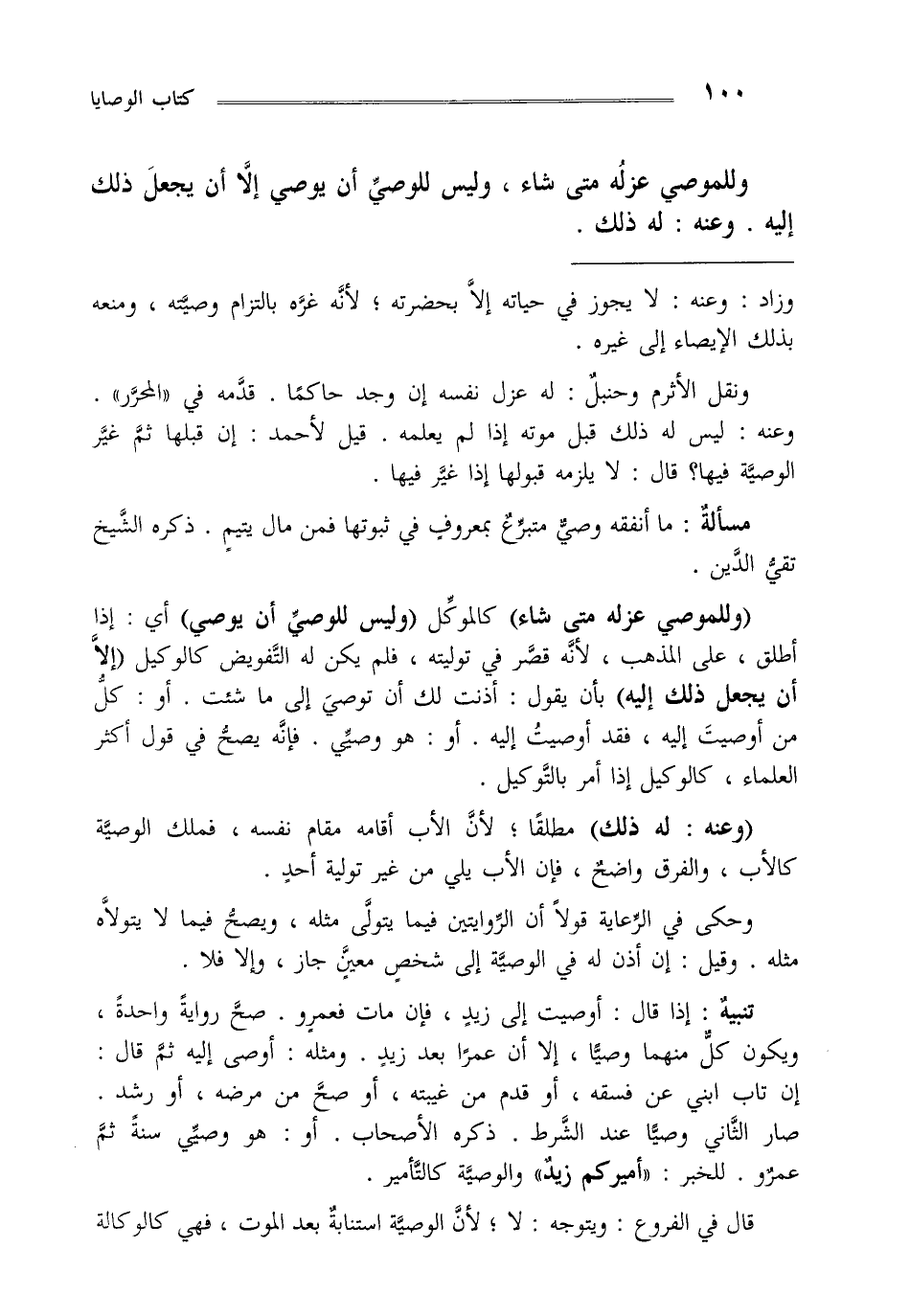 مسألة: ما أنفقه وصي متبرع بمعروف في ثبوتها فمن مال يتيم ذكره الشيخ تقي الدين. "وللموصي عزله متى شاء" كالموكل "وليس للوصي أن يوصي" أي: إذا أطلق على المذهب لأنه قصر في توليته فلم يكن له التفويض كالوكيل "إلا أن يجعل ذلك إليه" بأن يقول أذنت لك أن توصي إلى ما شئت أو كل من أوصيت إليه فقد أوصيت إليه أو هو وصي فإنه يصح في قول أكثر العلماء كالوكيل إذا أمر بالتوكيل.