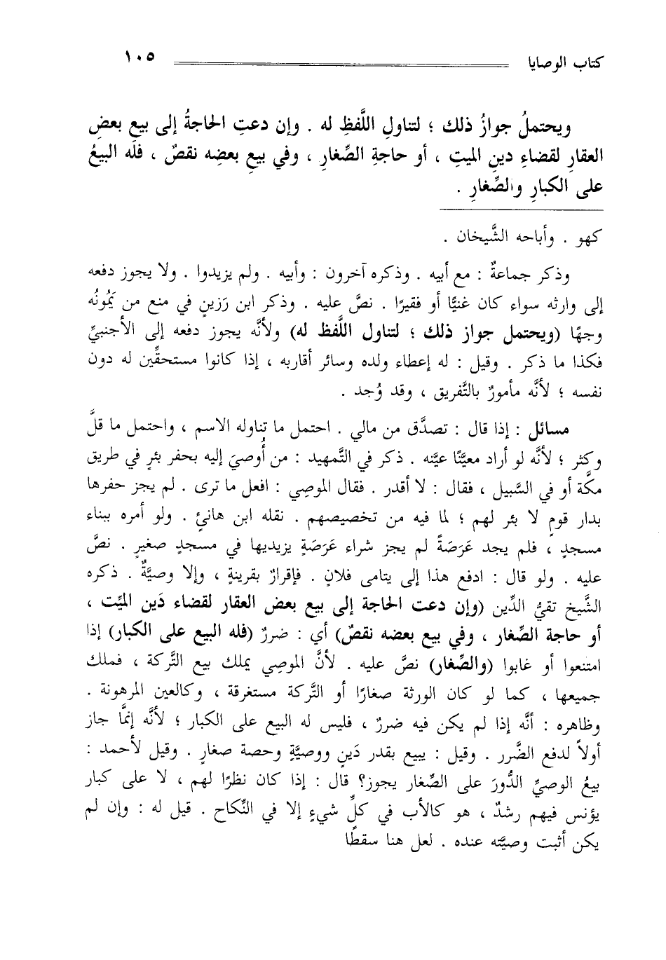 مسائل: إذا قال: تصدق من مالي احتمل ما تناوله لاسم واحتمل ما قل وكثر لأنه لو أراد معينا عينه ذكر في التمهيد من أوصي إليه بحفر بئر في طريق مكة أو في السبيل فقال لا أقدر فقال الموصي افعل ما ترى لم يجز حفرها بدار قوم لا بئر لهم لما فيه من تخصيصهم نقله ابن هانيء ولو أمره ببناء مسجد فلم يجد عرصة لم يجز شراء عرصة يزيديها في مسجد صغير نص عليه ولو قال: ادفع هذا إلى يتامى فلان فإقرار بقرينة وإلا وصية ذكره الشيخ تقي الدين "وإن دعت الحاجة إلى بيع بعض العقار لقضاء دين الميت أو حاجة الصغار وفي بيع بعضه نقص" أي: ضرر "فله البيع على الكبار" إذا امتنعوا أو غابوا "والصغار" نص عليه لأن الموصي يملك بيع التركة فملك جميعها كما لو كان الورثة صغارا أو التركة مستغرقة وكالعين المرهونة وظاهره: أنه إذا لم يكن فيه ضرر فليس له البيع على الكبار لأنه إنما جاز أولا لدفع الضرر وقيل: يبيع بقدر دين ووصية وحصة صغار وقيل: لأحمد بيع الوصي الدور على الصغار يجوز قال: إذا كان نظرا لهم لا على كبار يؤنس فيهم رشد هو كالأب في كل شيء إلا في النكاح قيل له وإن لم يكن أثبت وصيته عنده. لعل هنا سقطاً