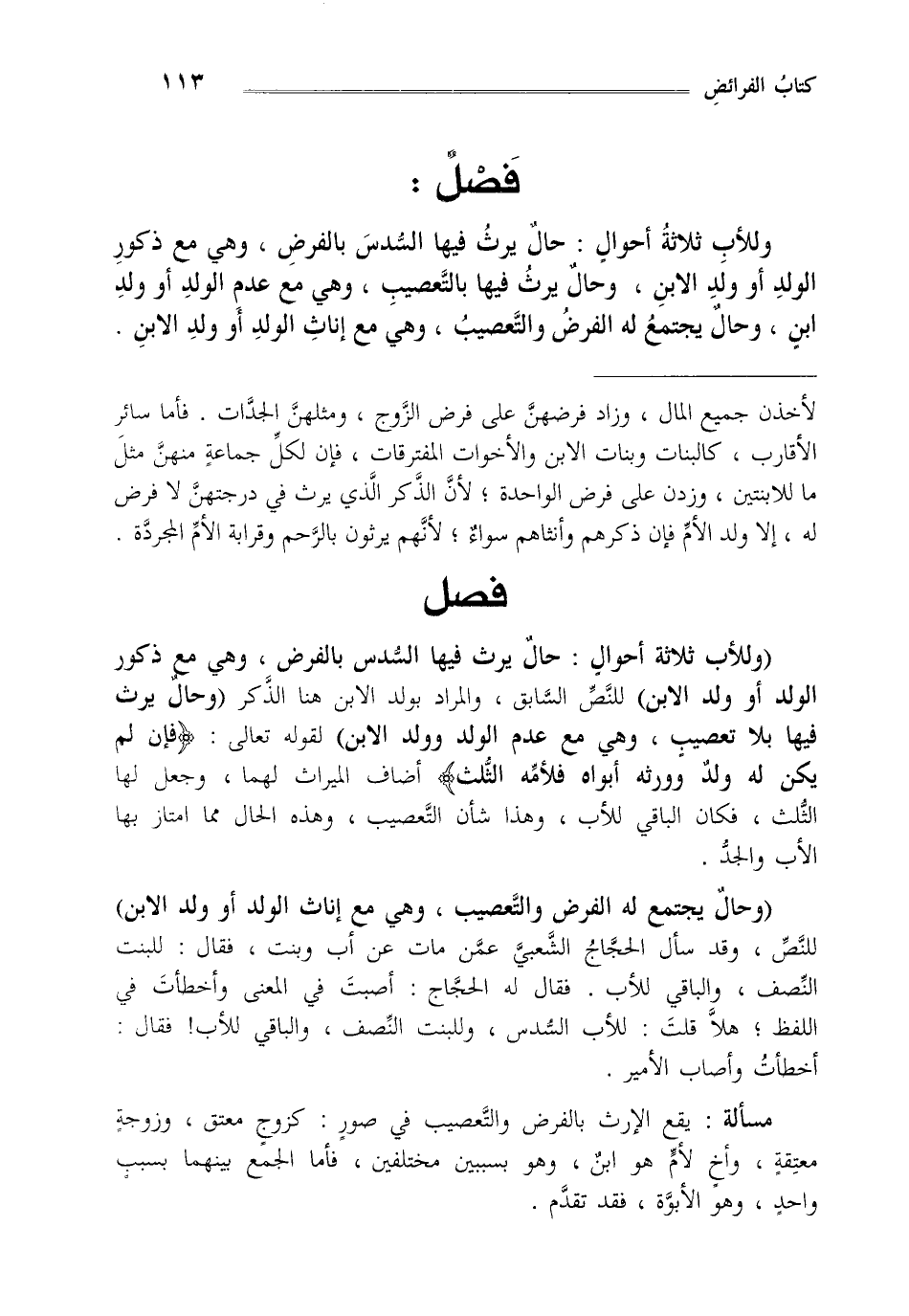"وللأب ثلاثة أحوال حال يرث فيه السدس بالفرض وهي مع ذكور الولد أو ولد الابن" للنص السابق والمراد بولد الابن هنا الذكر "وحال يرث فيها بلا تعصيب وهي مع عدم الولد وولد الابن" لقوله تعالى: {فَإِنْ لَمْ يَكُنْ لَهُ وَلَدٌ وَوَرِثَهُ أَبَوَاهُ فَلِأُمِّهِ الثُّلُثُ} أضاف الميرث لهما وجعل لها الثلث فكان الباقي للأب وهذا شأن التعصيب وهذه الحال مما امتاز بها الأب والجد.