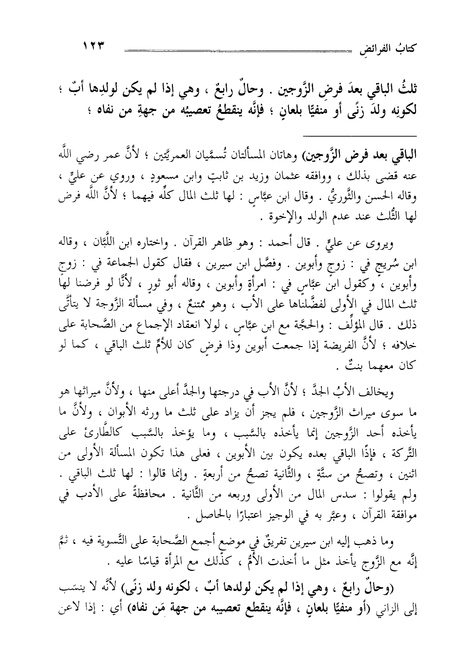 الباقي بعد فرض الزوجين" وهاتان المسألتان تسميان العمريتين لأن عمر رضي الله عنه قضى بذلك ووافقه عثمان وزيد بن ثابت وابن مسعود وروي عن علي وقاله الحسن والثوري وقال بن عباس لها ثلث المال كله فيهما لأن الله فرض لها الثلث عند عدم الولد والإخوة.