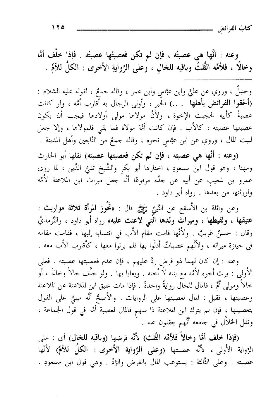 وحنبل وروي عن علي وابن عباس وابن عمر وقاله جمع لقوله عليه السلام: "ألحقوا الفرائض بأهلها" الخبر وأولى الرجال به أقارب أمه ولو كانت عصبة كأبيه لحجبت الإخوة ولأن مولاها مولى أولادها فيجب أن يكون عصبتها عصبته كالأب فإن كانت أمه مولاة فما بقي فلمولاها وإلا جعل لبيت المال وروي عن ابن عباس نحوه وقاله جمع من التابعين وأهل المدينة.