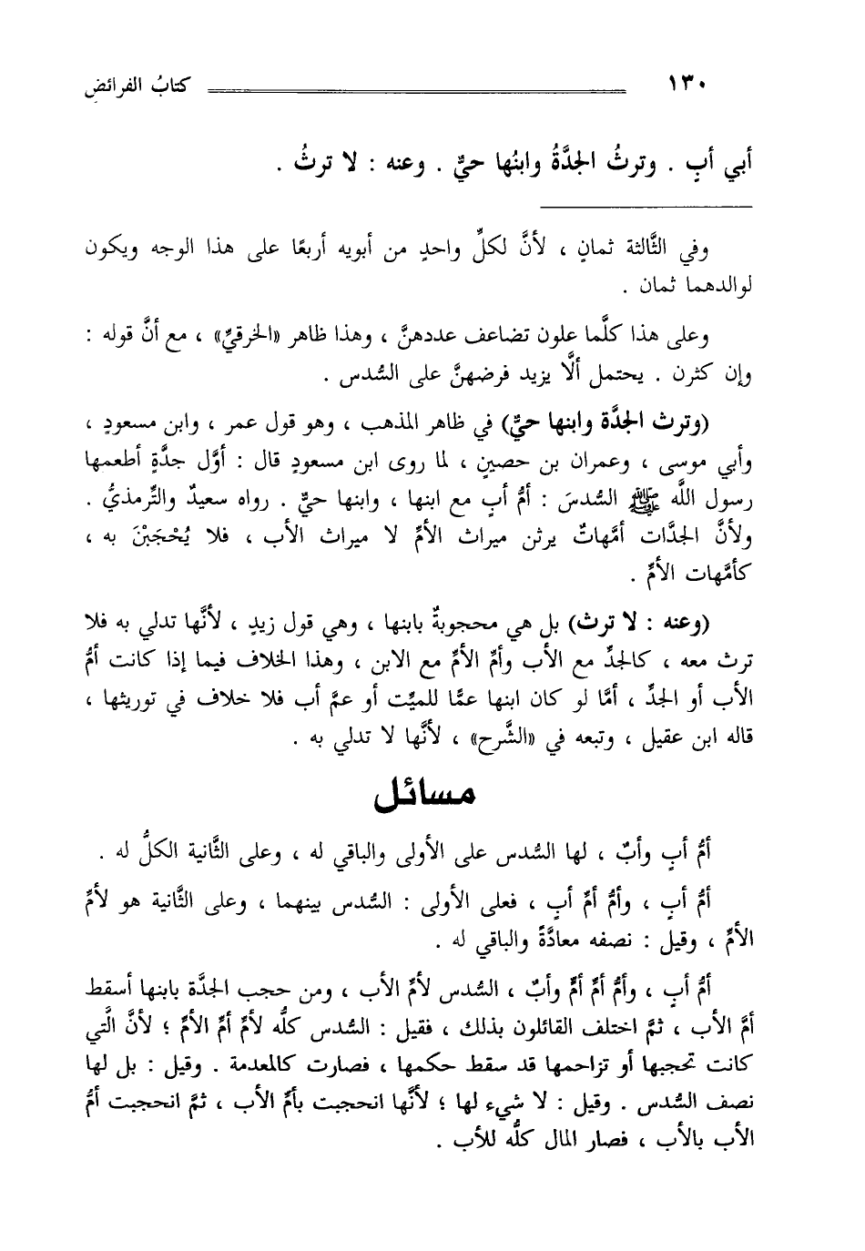 "وترث الجدة وابنها حي" في ظاهر المذهب وهو قول عمر وابن مسعود وأبي موسى وعمران بن حصين لما روى ابن مسعود قال أول جدة أطعهما رسول الله صلى الله عليه وسلم السدس أم أب مع ابنها وابنها حي رواه سعيد والترمذي ولأن الجدات العالمين يرثن ميراث الأم لا ميراث الأب فلا يحجبن به كأمهات الأم.