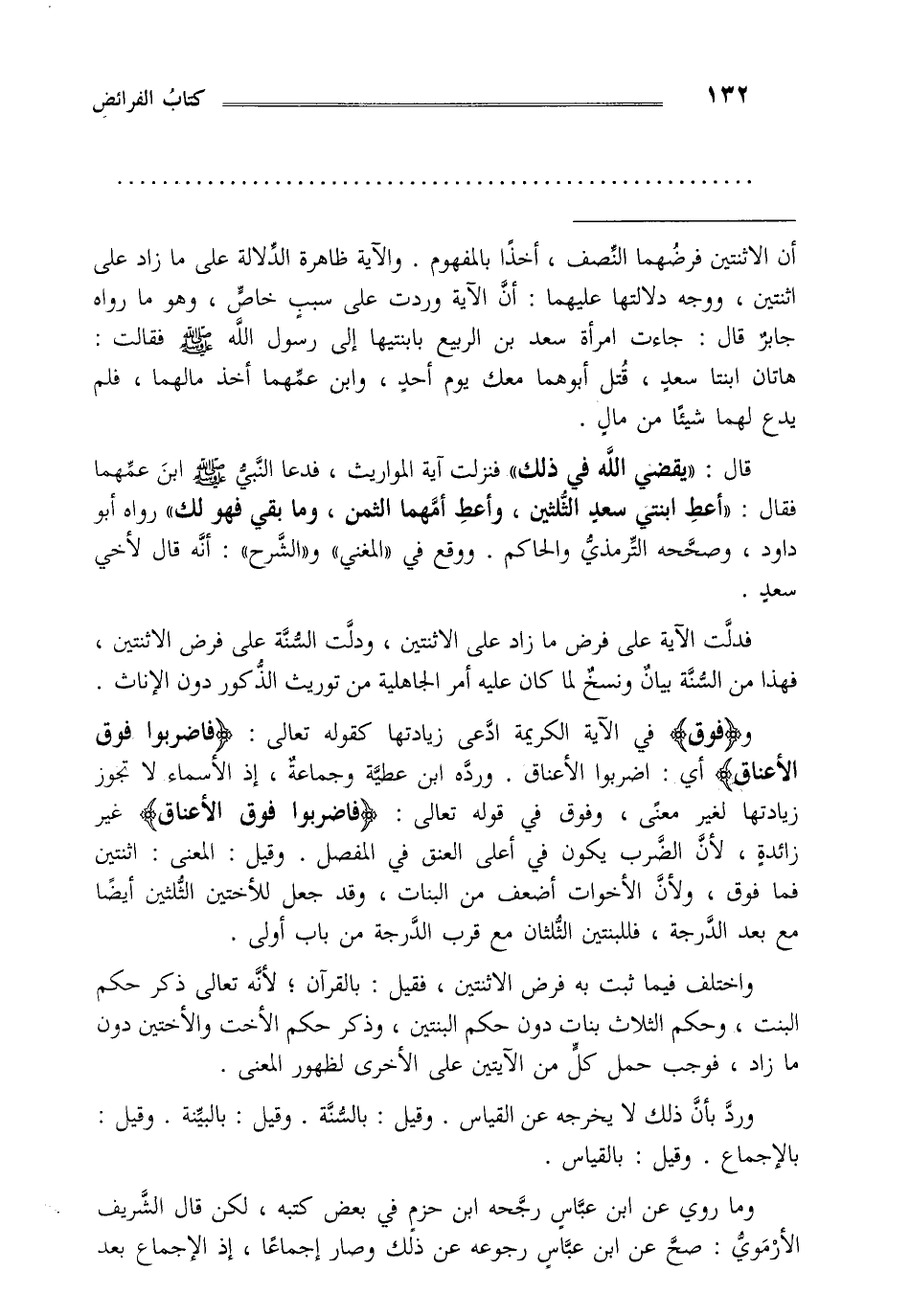 و"فوق" في الاية الكريمة ادعي زيادتها كقوله تعالى: {فَاضْرِبُوا فَوْقَ الْأَعْنَاقِ} أي: اضربوا الأعناق ورده ابن عطيه وجماعة إذ الأسماء لا تجوز زيادتها لغير معنى وفوق في قوله تعالى: {فَاضْرِبُوا فَوْقَ الْأَعْنَاقِ} غير زائدة لأن الضرب يكون في أعلا العنق في المفصل وقيل: المعنى اثنتين فما فوق ولأن الأحوات أضعف من البنات وقد جعل للأختين الثلثين أيضا مع بعد الدرجة فللبنتين الثلثان مع قرب الدرجة من باب أولى.