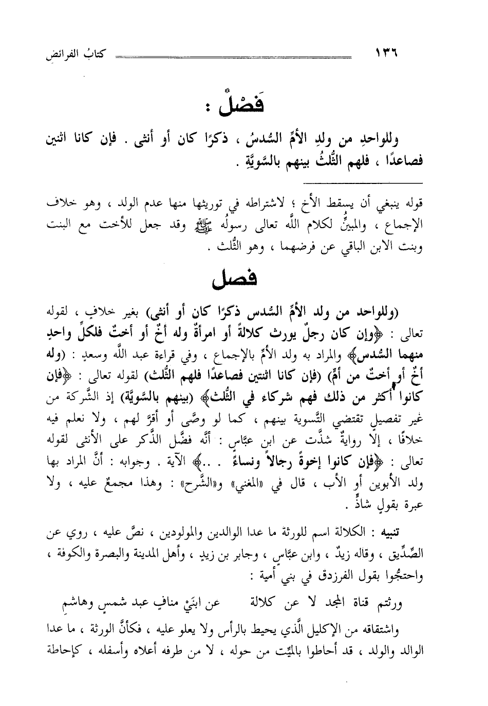 "وللواحد من ولد الأم السدس ذكرا كان أو أنثى" بغير خلاف لقوله تعالى :{وَإِنْ كَانَ رَجُلٌ يُورَثُ كَلالَةً أَوِ امْرَأَةٌ وَلَهُ أَخٌ أَوْ أُخْتٌ فَلِكُلِّ وَاحِدٍ مِنْهُمَا السُّدُسُ} والمراد به ولد الأم بالإجماع وفي قراءة عبد الله وسعد: "وله أخ أو أخت من أم" "فإن كانا اثنتين فصاعدا فلهم الثلث" لقوله تعالى: {فَإِنْ كَانُوا أَكْثَرَ مِنْ ذَلِكَ فَهُمْ شُرَكَاءُ فِي الثُّلُثِ} "بينهم بالسوية" إذ الشركة من غير تفصيل تقتضي التسوية بينهم كما لو وصى أو أقر لهم ولا نعلم فيه خلافا إلا رواية شذت عن ابن عباس أنه فضل الذكر على الأنثى لقوله تعالى: {وَإِنْ كَانُوا إِخْوَةً رِجَالاً وَنِسَاءً} الاية وجوابه أن المراد بها ولد الأبوين أو الأب قال في المغني والشرح وهذا مجمع عليه ولا عبرة بقول شاذ.