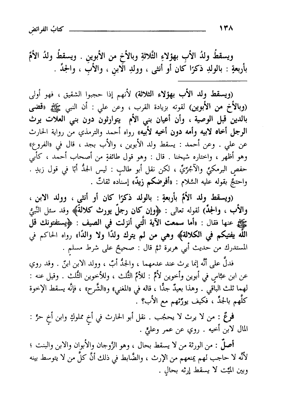 "ويسقط ولد الأب بهؤلاء الثلاثة" لأنهم إذا حجبوا الشقيق فهو أولى "وبالأخ من الأبوين" لقوته بزيادة القرب وعن علي أن النبي صلى الله عليه وسلم "قضى بالدين قبل الوصية وأن أعيان بني الأم يتوارثون دون بني العلات يرث الرجل أخاه لأبيه وأمه دون أخيه لأبيه" رواه أحمد والترمذي من رواية الحارث عن علي وعن أحمد يسقط ولد الأبوين والأب بجد قال في الفروع: وهو أظهر واختاره شيخنا قال وهو قول طائفة من أصحاب أحمد كأبي حفص البرمكي والآجري لكن نقل أبو طالب ليس الجد أبا في قول زيد واحتج بقوله عليه السلام: "أفرضكم زيد" إسناده ثقات.